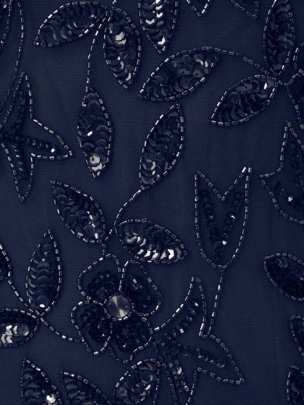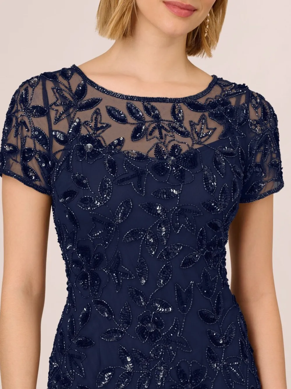 A work of art: our long and romantic gown dazzles with all-over handsewn beading in a feminine floral pattern that catches the light with every twirl. A streamlined silhouette is eased with the mermaid skirt with godets to create the right amount of movement All the details: our iconic (and flattering) no waist seam, sheer illusion yoke and cap sleeves Sleek back zip closure Sponge clean only. 100% Polyester.
