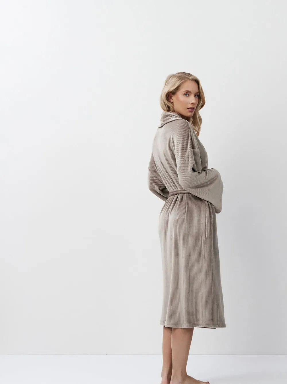 Luxurious, long bathrobe with a super soft ribbed texture in a soft muted Taupe Brown colour. Features full-length sleeves with low cuffs. Hidden side pockets for a sleek look. Tied with a belt. Designed to fall below the knee. Washable. 95% Polyester, 5% Elastane.