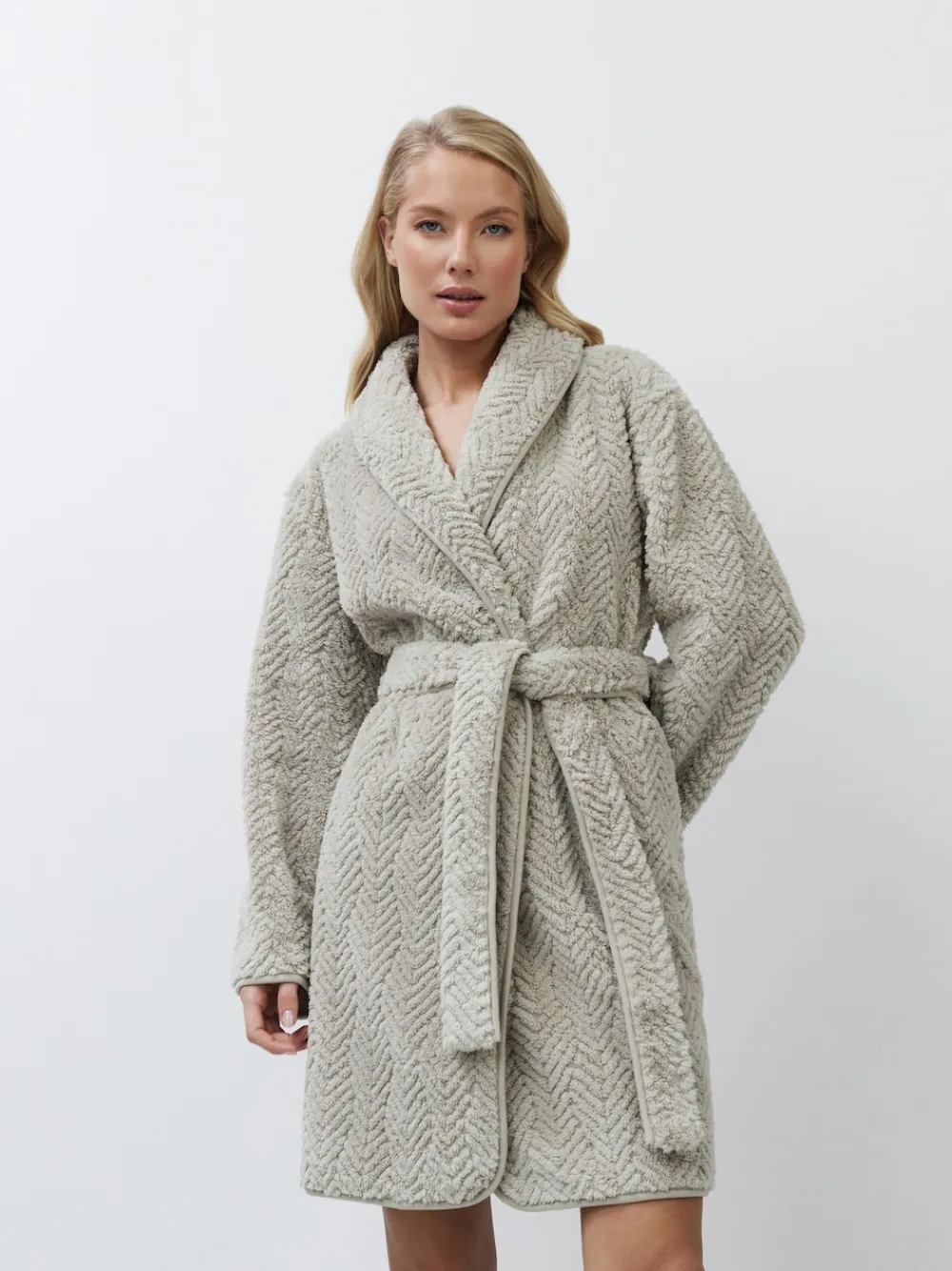 Short, textured bathrobe with a plush chevron pattern in a muted taupe colour. Made of soft and warm 2-sided polyester fabric. Inside is a smooth and soft material for extra comfort. Outside is a plush teddy effect texture for a cosy feel. Designed with a shawl collar for added warmth. Features full-length sleeves with low cuffs & side pockets. Delicate edging details enhance the collar, cuffs, and hemline. Tied with a belt. Designed to fall above the knee. Washable. 100% Polyester.