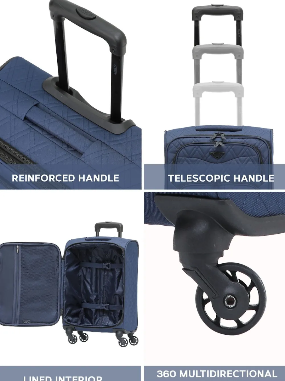 Cabin 21″ Dimensions: 55x35x20cm (All Parts), 48x35x20cm (Body), Weight: 2.4Kg, Capacity: 35LThe hand luggage is compatible with more than 100 airlines worldwide. These include easyJet, Ryanair, Air France, TUI, Qantas, Etihad, KLM, Virgin Atlantic, Emirates, Delta, Jet2 and Turkish.Featuring rip resistant luxurious and superior 800D hard wearing polyester material withstanding the rigours of modern transport and airline handling protecting your contents during your travels.The adjustable handle, which can be folded four times thanks to a button, will allow easy and comfortable movement. Multiple compartments with zips allowing quick access to your essentials. The four resistant wheels allow for easy, quiet and stable movement at 360 degrees. Height 55cm Width 35cm Depth 20cm 0% ABS (Acrylonitrile Butadiene Styrene).
