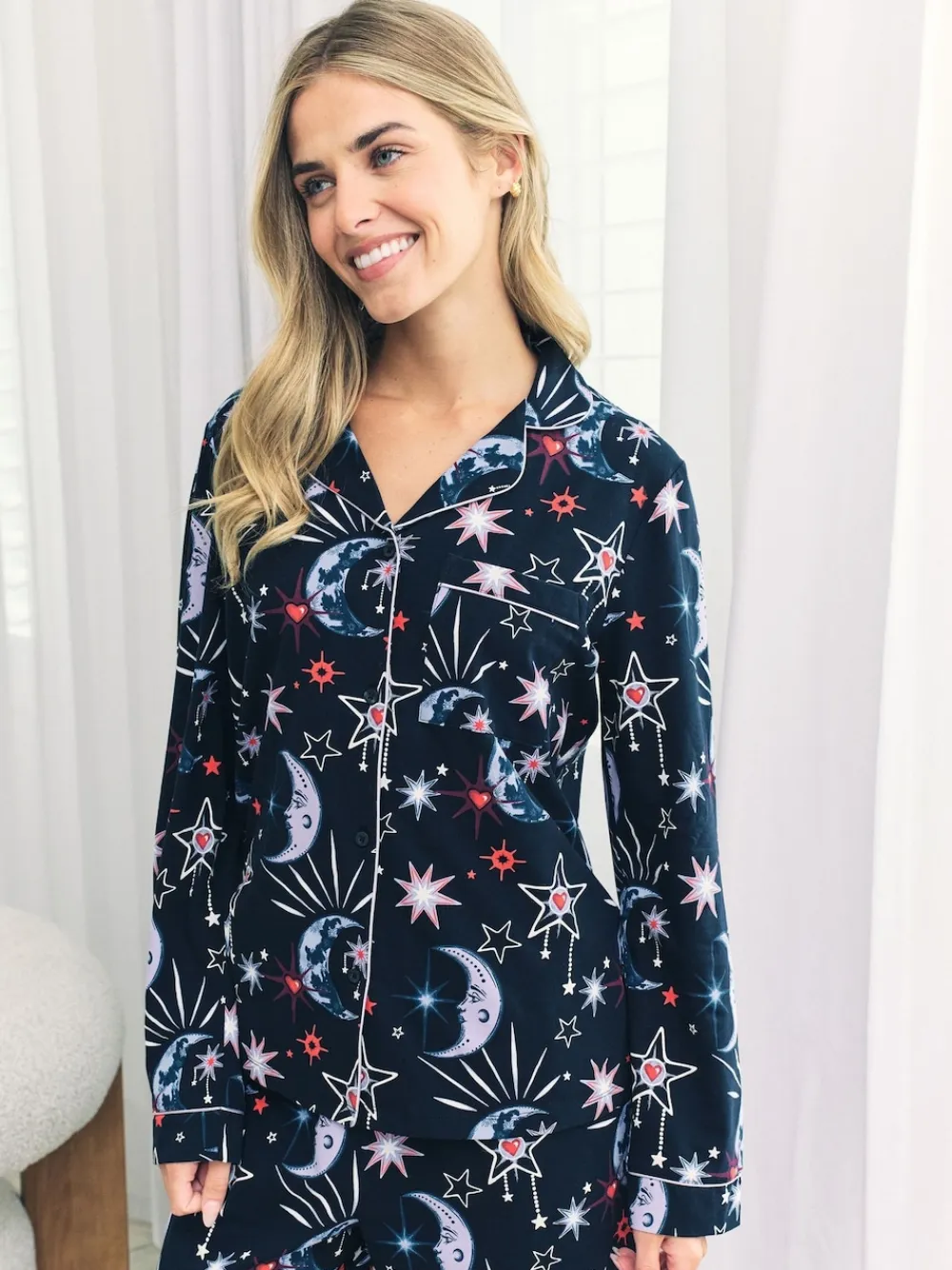 Drift into the dreamworld with our Mystic Moon pyjamas set, crafted in soft navy cotton and scattered with hand-drawn crescent moons and glittering stars. Like a midnight sky steeped in mystery, this celestial print sets the tone for tranquil evenings and stargazing sleep-ins. Designed with a timeless revere collar shirt, chest pocket, and elegant contrast piping, it’s paired with full-length bottoms featuring an elasticated waistband and handy side pockets for ultimate comfort.This set is naturally breathable, gentle on skin, and perfect for lounging under the stars. Machine washable. 95% Cotton, 5% Elastane. Warning: Keep away from fire and flames.