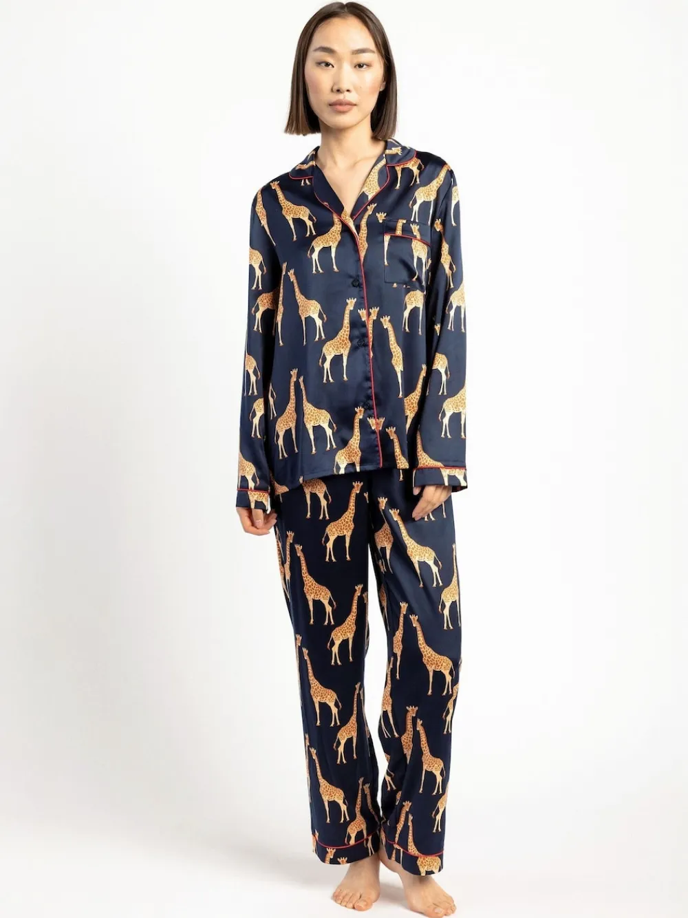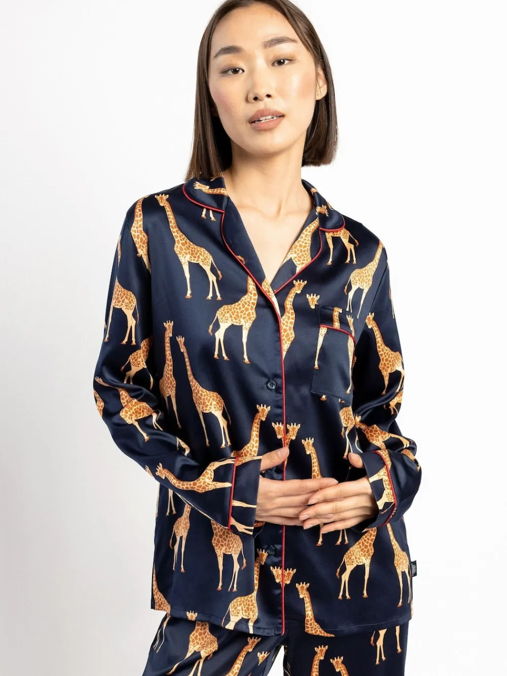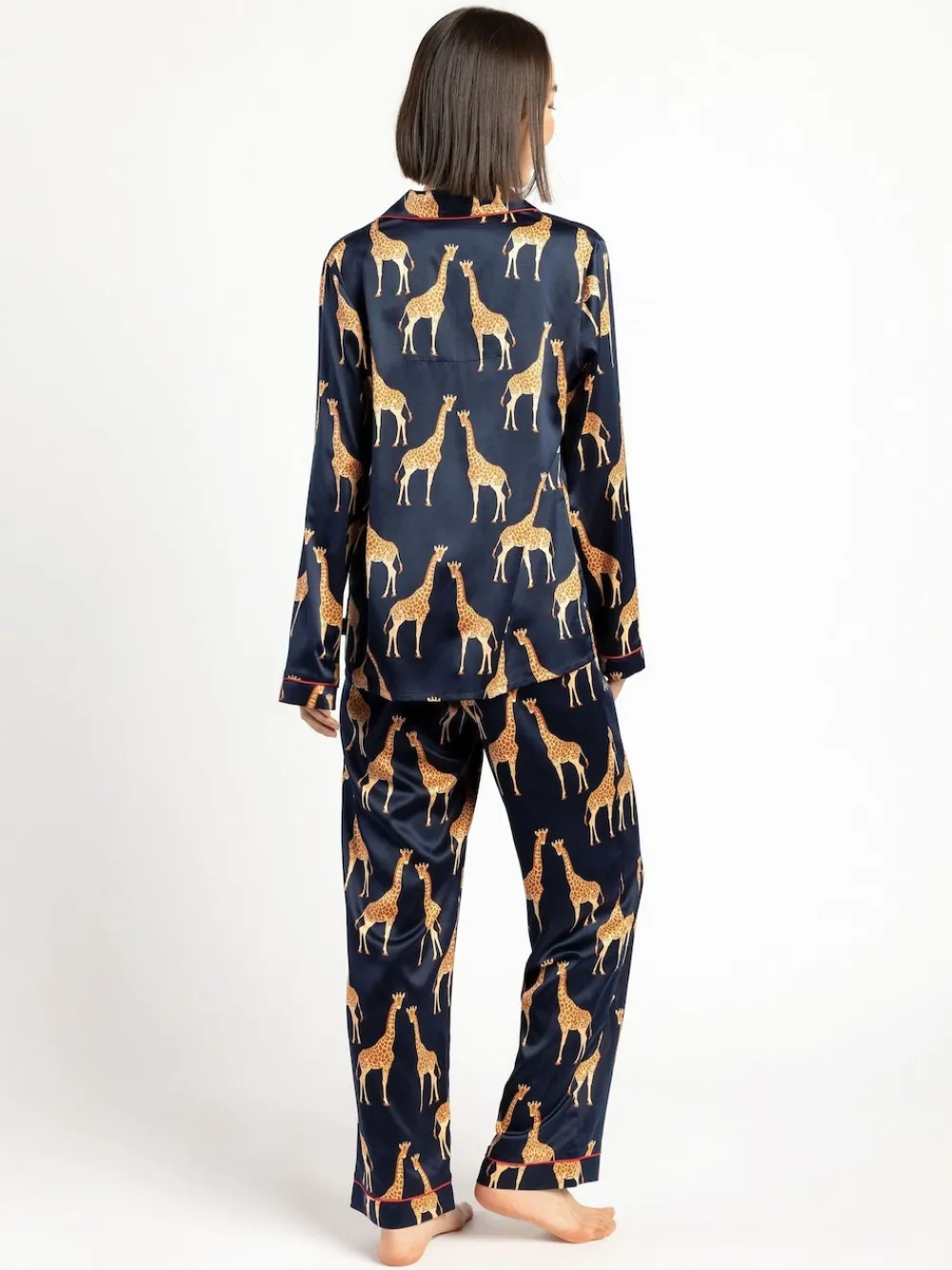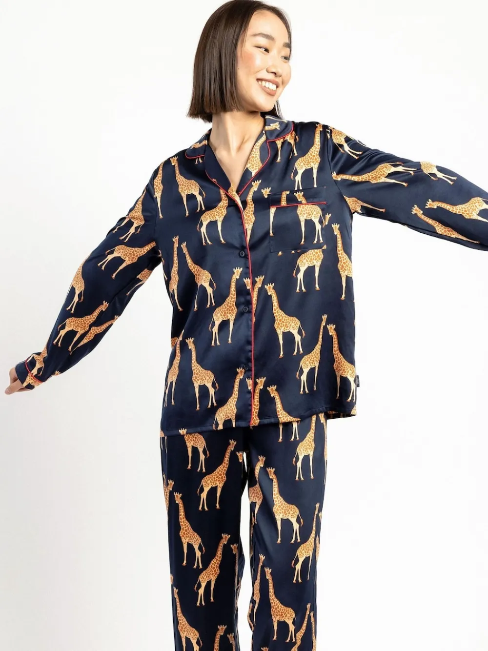 Stand tall in our Giraffe Revere Button Up pyjama set. Crafted from our silky satin fabric, nothing will feel softer on your skin. The elasticated waist and relaxed fit shirt means you can lounge in complete luxury. Machine washable. 97% Polyester, 3% Elastane. Warning: Keep away from fire and flames.