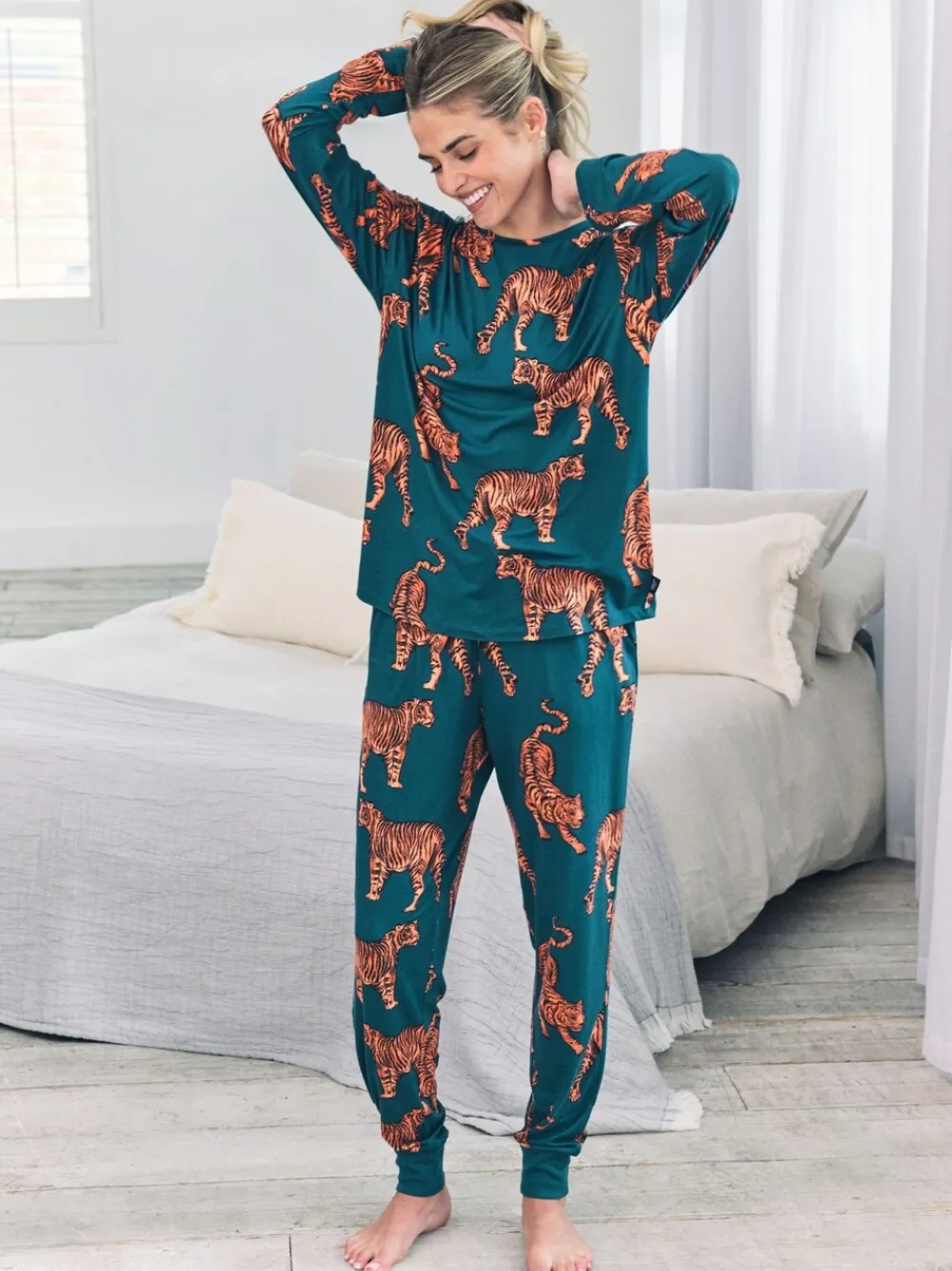 Unwind in bold style with this striking pyjama set, featuring a hand-drawn print of fiery orange tigers on a lush teal backdrop. Made from irresistibly soft fibre jersey, this cosy set brings a playful edge to your wind-down wardrobe. The long-sleeved top has a classic round crew neckline and pairs perfectly with full-length bottoms, complete with an elasticated drawstring waist for a personalised fit. Cuffs and handy side pockets add to the comfort factor—ideal for slow mornings and cosy evenings alike. Machine washable. 95% Polyester, 5% Elastane. Warning: Keep away from fire and flames.