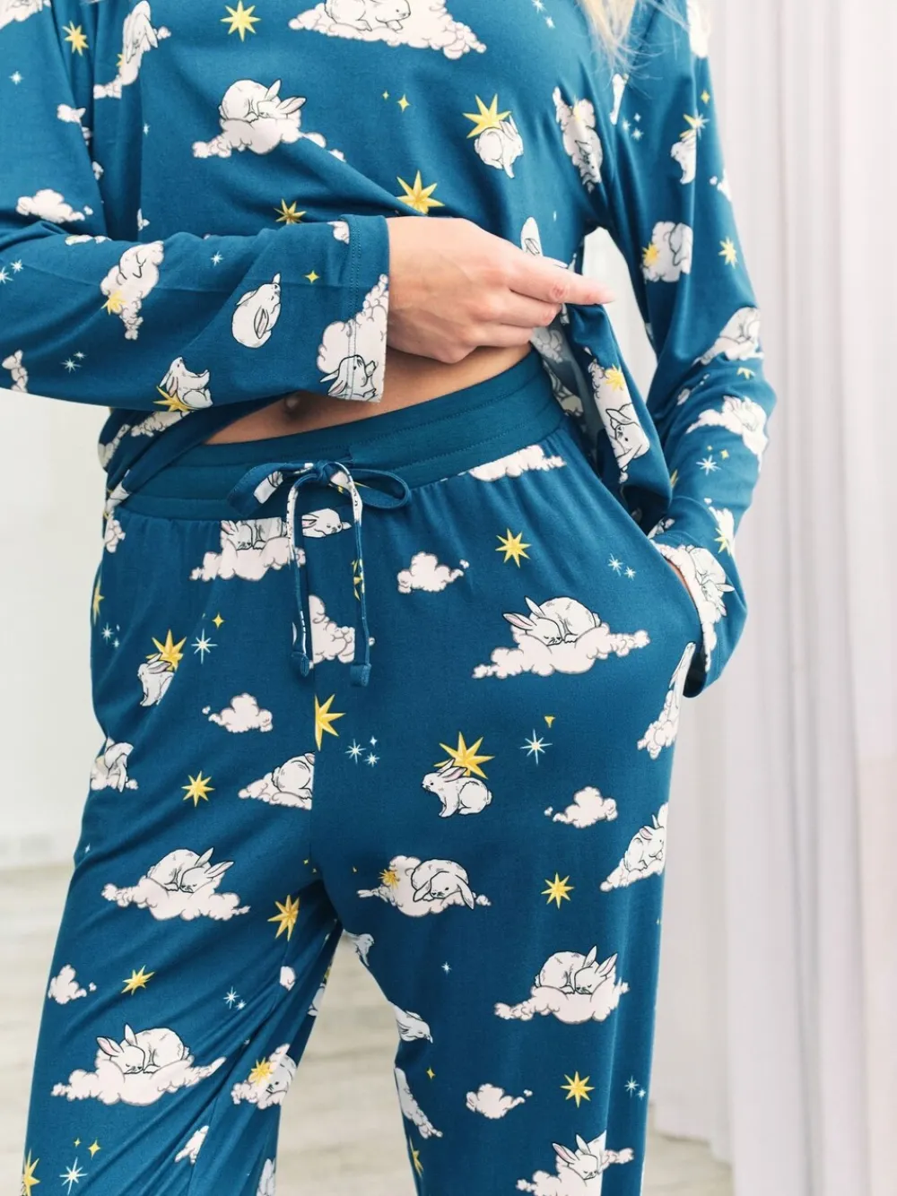 Get whisked away to dreamland with our Celestial Bunny Print long pyjama set, where fluffy clouds, golden stars, and the sleepy bunny rabbits create a bedtime scene straight from a storybook. Each hand-drawn bunny is curled up or gazing skyward, nestled among fluffy clouds and scattered constellations on a deep twilight sky. Crafted from soft, stretchy jersey made with 95% fibres, this set features a relaxed long-sleeve top with cuffs and a cosy crew neck, paired with full-length bottoms with an adjustable drawstring waist and handy pockets. It’s comfort wrapped in a little night-sky magic. Machine washable. 95% Polyester, 5% Elastane. Warning: Keep away from fire and flames.