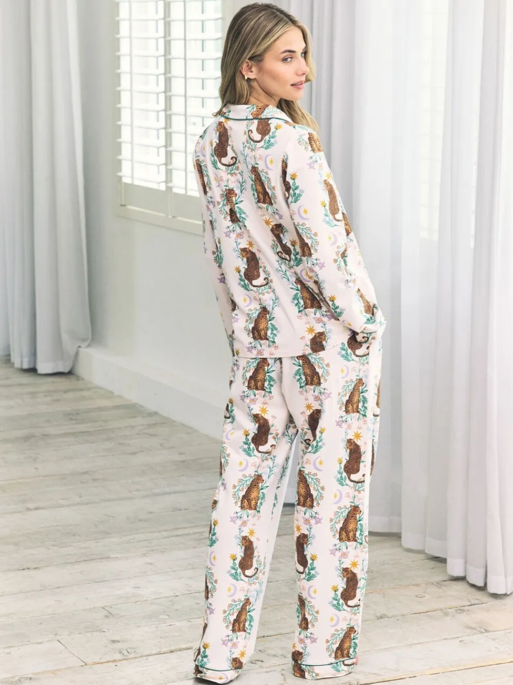 In our soft, cotton fabric, this long pyjamas set pairs a classic button-up long sleeve shirt with elasticated waist long bottoms in an iconic new print. Hand-drawn by our team of talented artists, our signature leopard nestles in amongst a bed of blooming flowers, with a delicate moon and stars the finishing touch. Machine washable. 95% Cotton, 5% Elastane. Warning: Keep away from fire and flames.