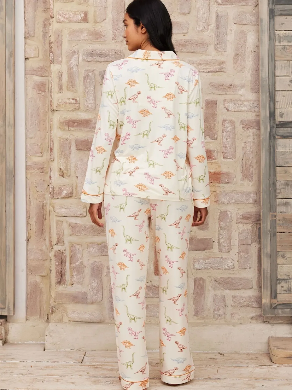Calling all dinosaur lovers! From t-rex to triceratops, indulge in your inner palaeontologist in these soft jersey short pyjamas (White). With a long sleeve button up shirt and matching pyjama bottoms, this easy to wear set is finished with bright orange contrasting piping. Machine washable. 95% Polyester, 5% Elastane. Warning: Keep away from fire and flames.