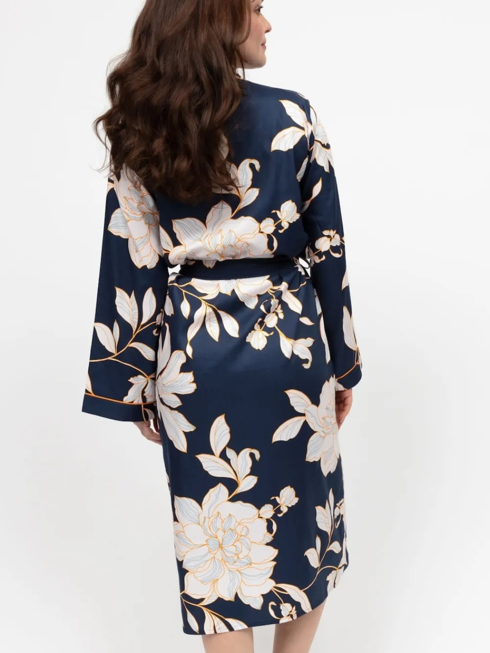 Create bedtime glamour in Cyberjammies’ printed long dressing gown. The top is trimmed with colour contrasting modal. In a wrap-front, kimono style, the dressing gown fastens at the front with a self-fabric belt and has two side pockets. Machine washable. 60% Cotton, 40% Modal. Warning: Keep away from fire and flames.