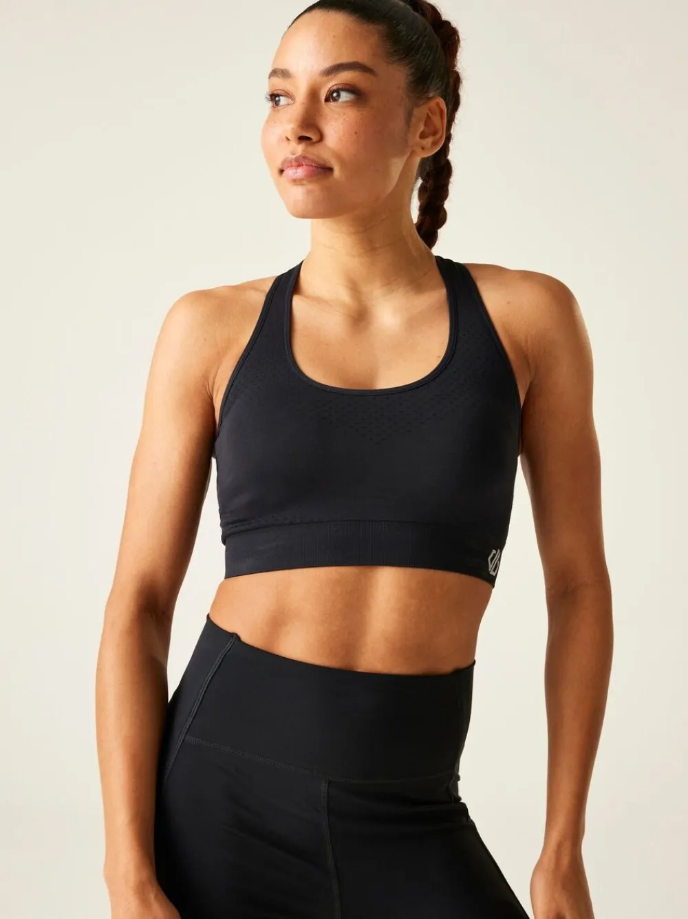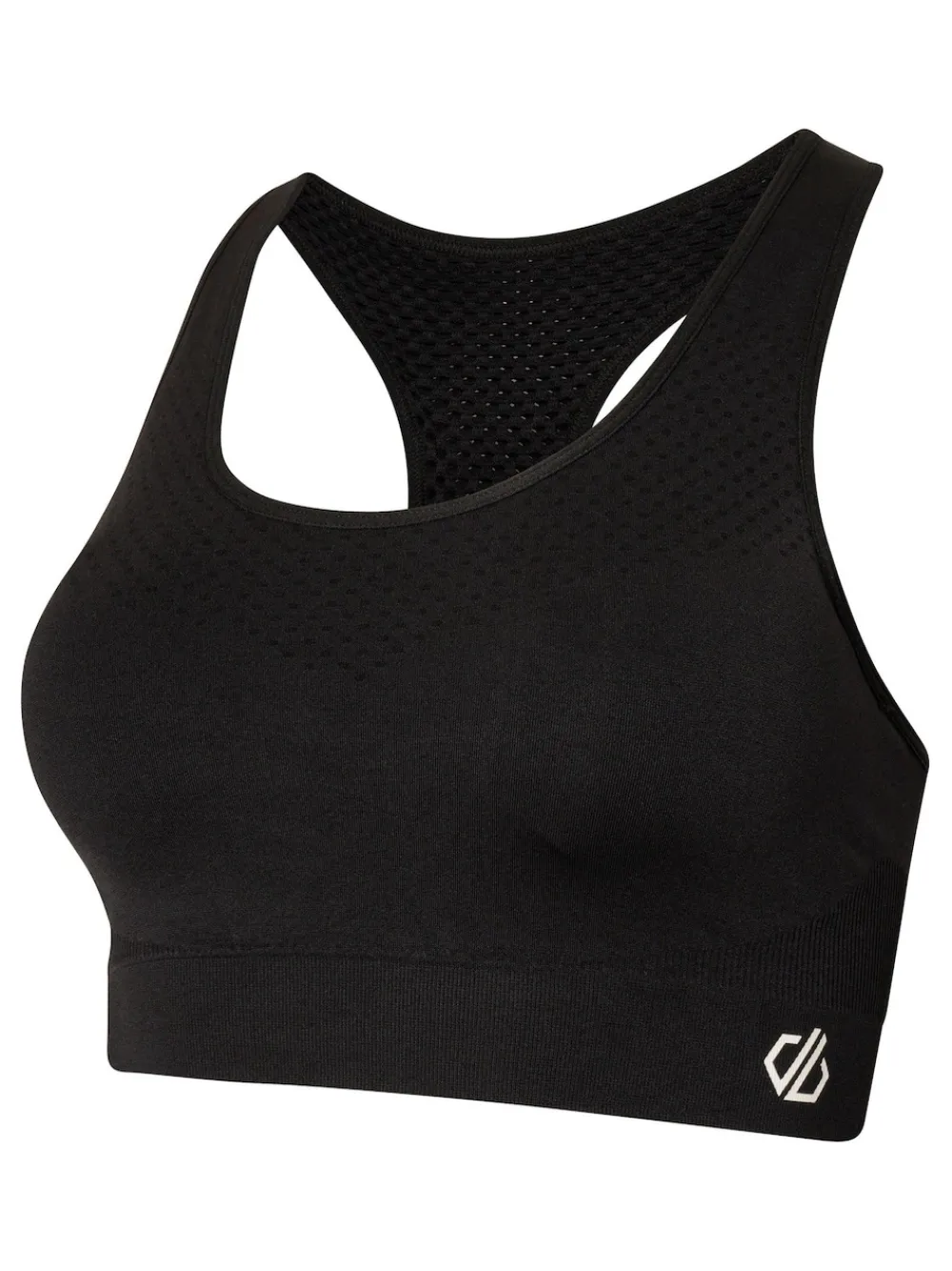 The Dare 2b Don’t Sweat It Bra is crafted from nylon, polyester and elastane blend, ensuring freshness and comfort during workouts. With its chemical-free anti-bacterial odour control treatment, the fabric efficiently wicks away sweat and prevents odour-causing bacteria growth. Seamless fabric provides friction-free comfort. This gym bra comes with a racerback design, offering light support and is designed for low impact activities. Customise your comfort with removable pads. Machine washable. 83% Polyester, 17% Elastane.