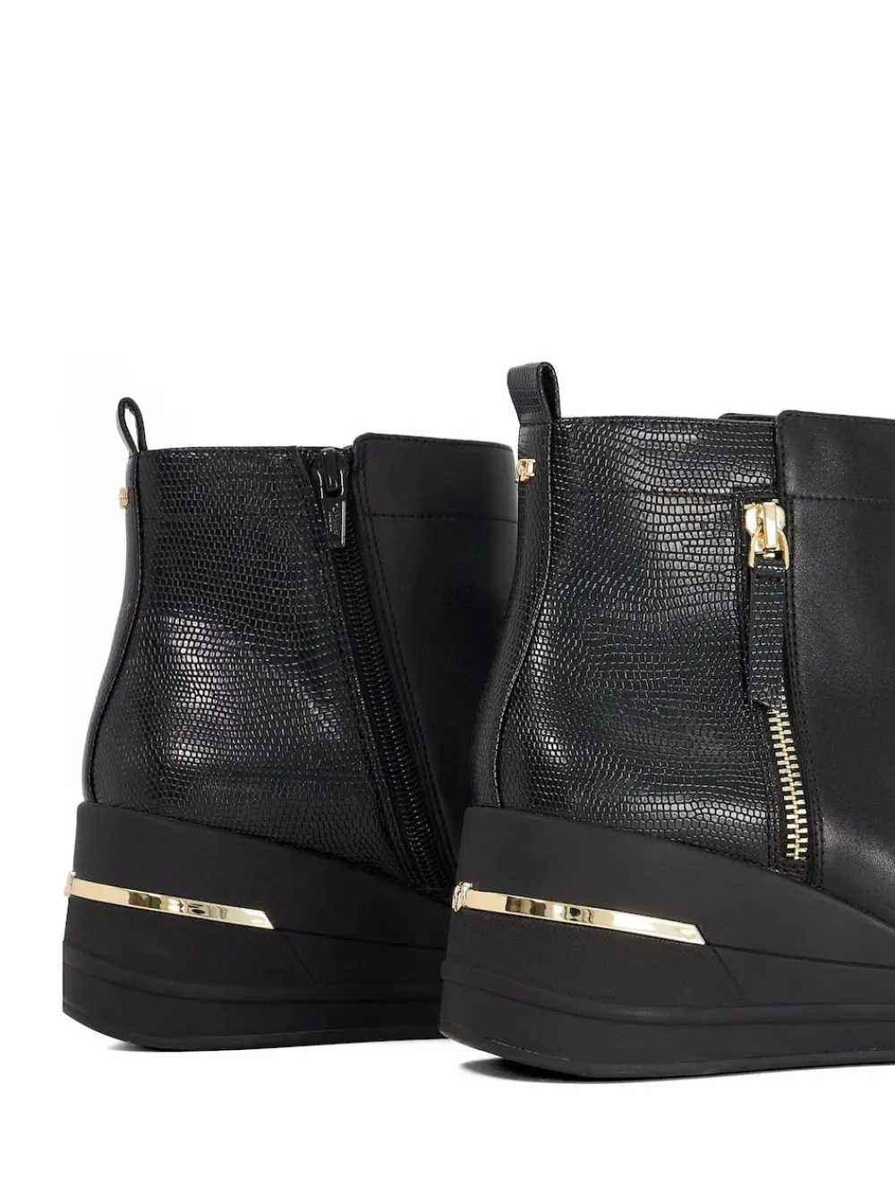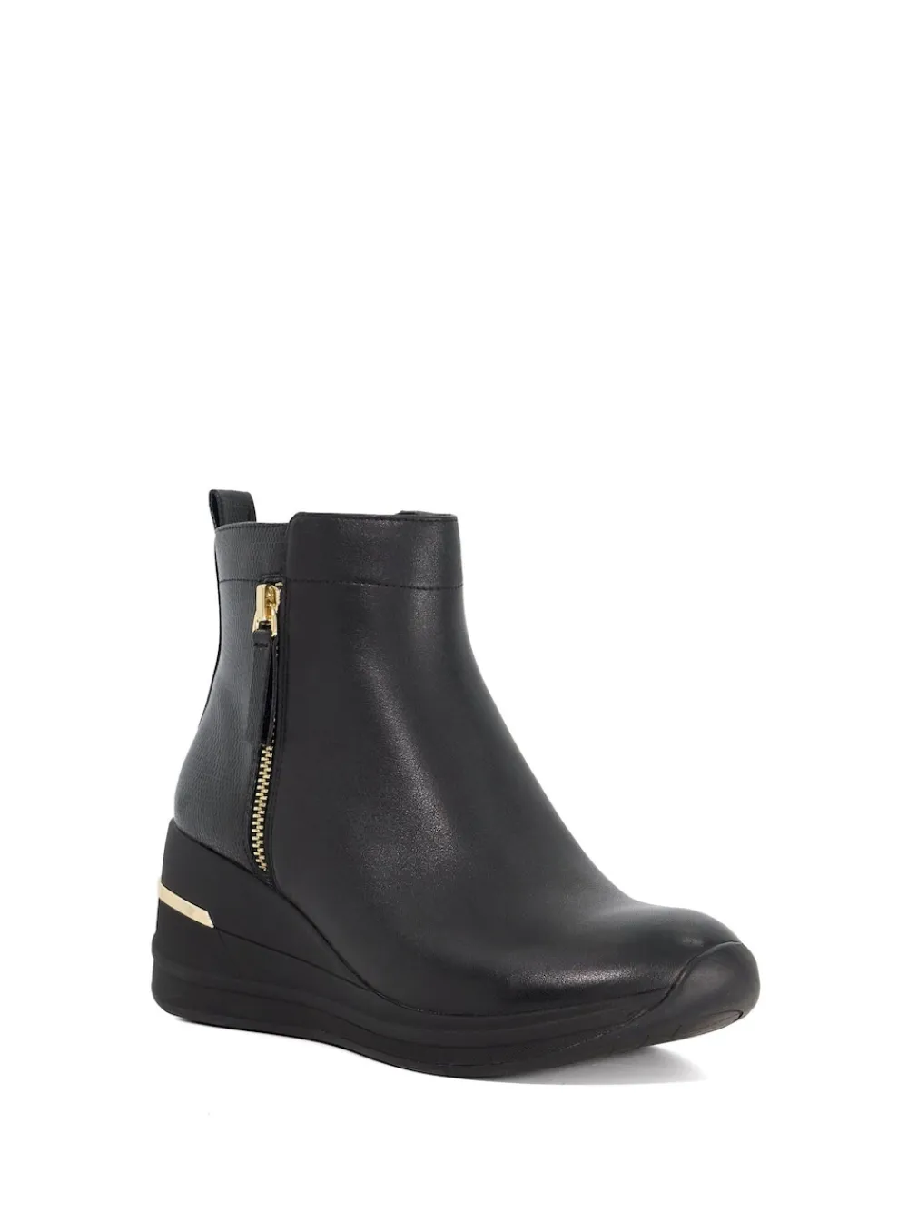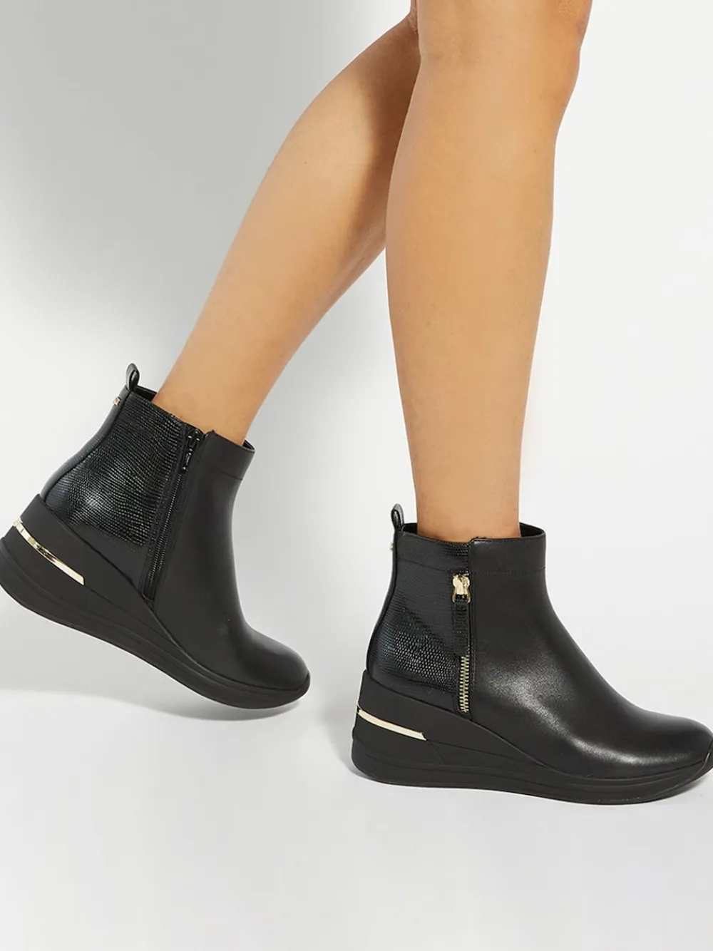 Step out in style and comfort with Everyone our black leather wedge ankle boots designed with everyday wear in mind. Featuring a sleek silhouette with a gold insert for a touch of luxe they re detailed with a side zip and rear pull tab for easy on-and-off. Lightweight and crafted for all-day comfort this versatile style is your go-to for effortless elevation. Main – Other Materials, Upper – Leather, Lining and Sock – Leather, Sole – Other Materials.
