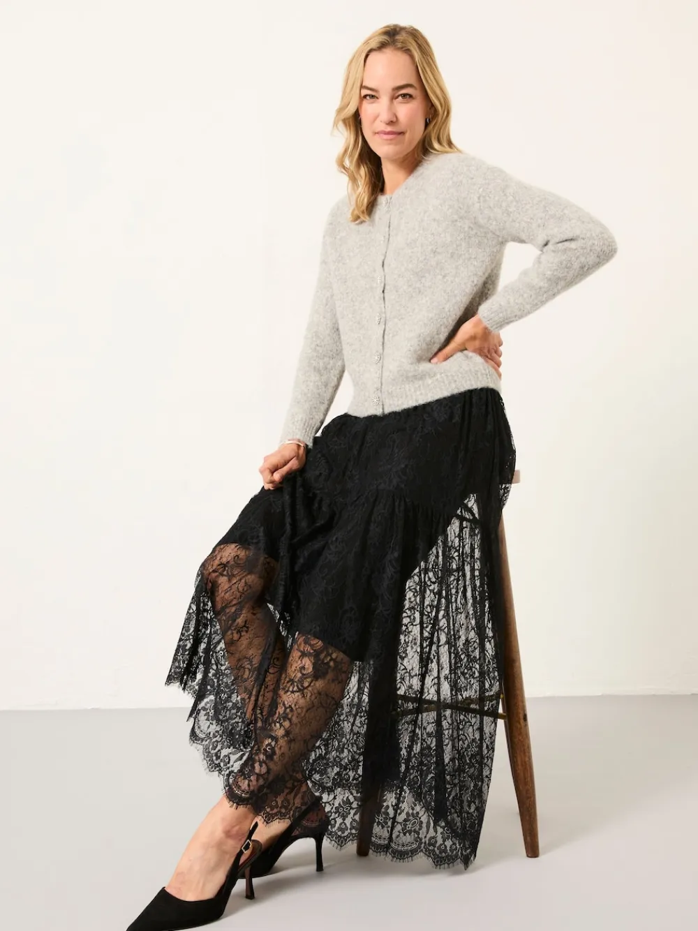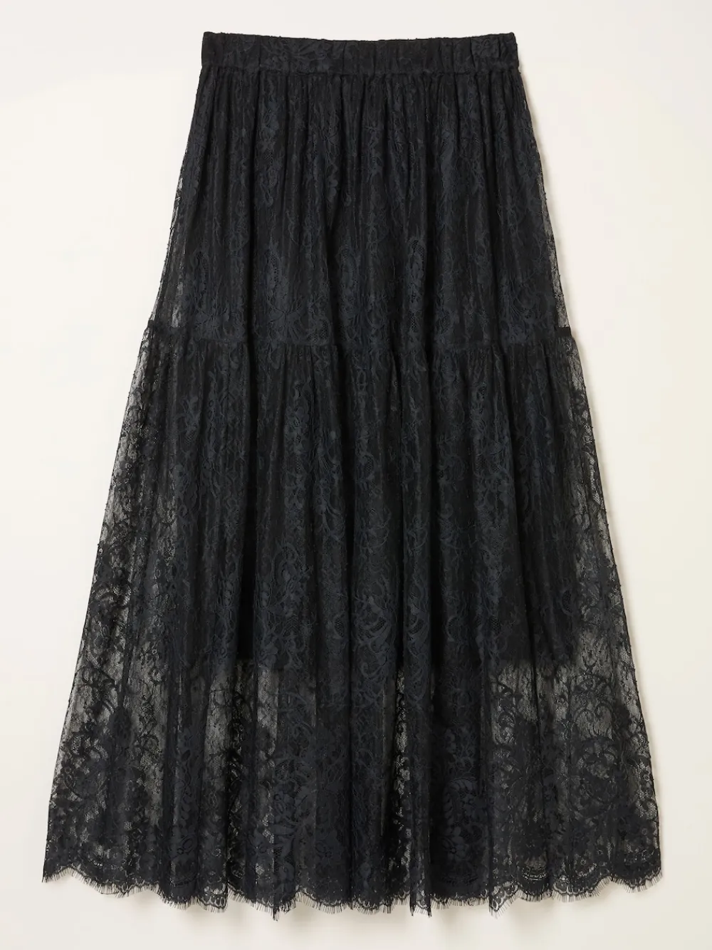Our Annie lace midi skirt features a shorter inner skirt topped with a sheer lace overlay that softly drapes over, creating a layered look full of texture and movement. The lace adds a delicate touch, while the shorter lining keeps it comfortable and easy to wear. Perfect for dressing up with heels or pairing with sneakers for a stylish everyday look, this skirt brings a fresh, modern twist to a classic fabric. Regular waistband to hem 36.5″ / 93cm. Machine washable. Shell 100% Nylon. Lining 100% LENZING™ ECOVERO™ Viscose.