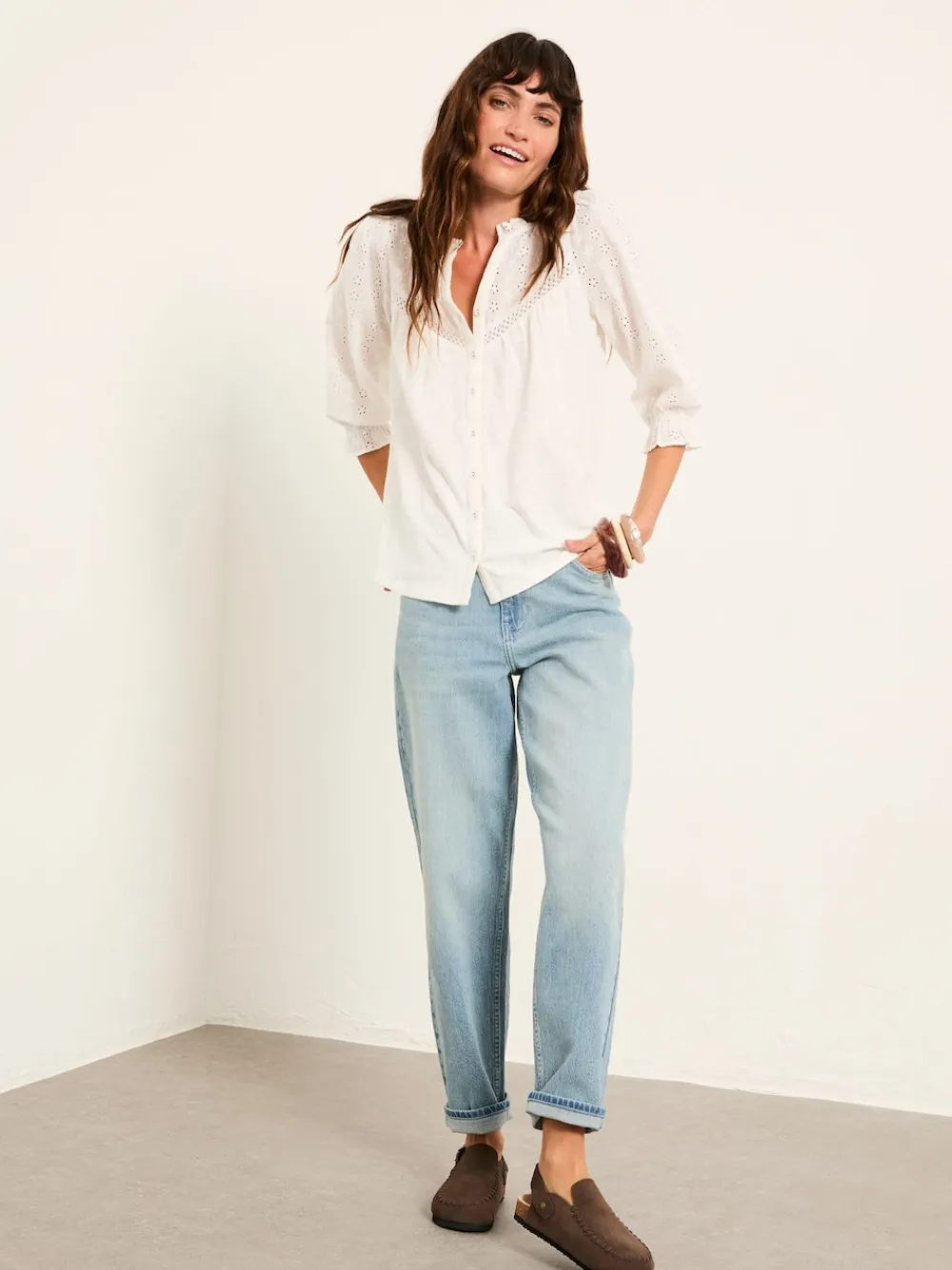 A fresh take on a timeless favourite. Our Claire broderie top features delicate embroidery, cuffed sleeves, and button detailing for a clean, classic finish. Made from 100% cotton, it’s lightweight, breathable, and perfect for warmer days. Pair it with denim or linen for an easy, polished look. Machine washable. 100% Cotton.