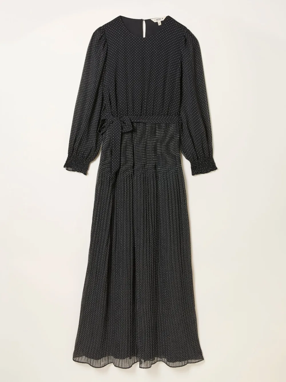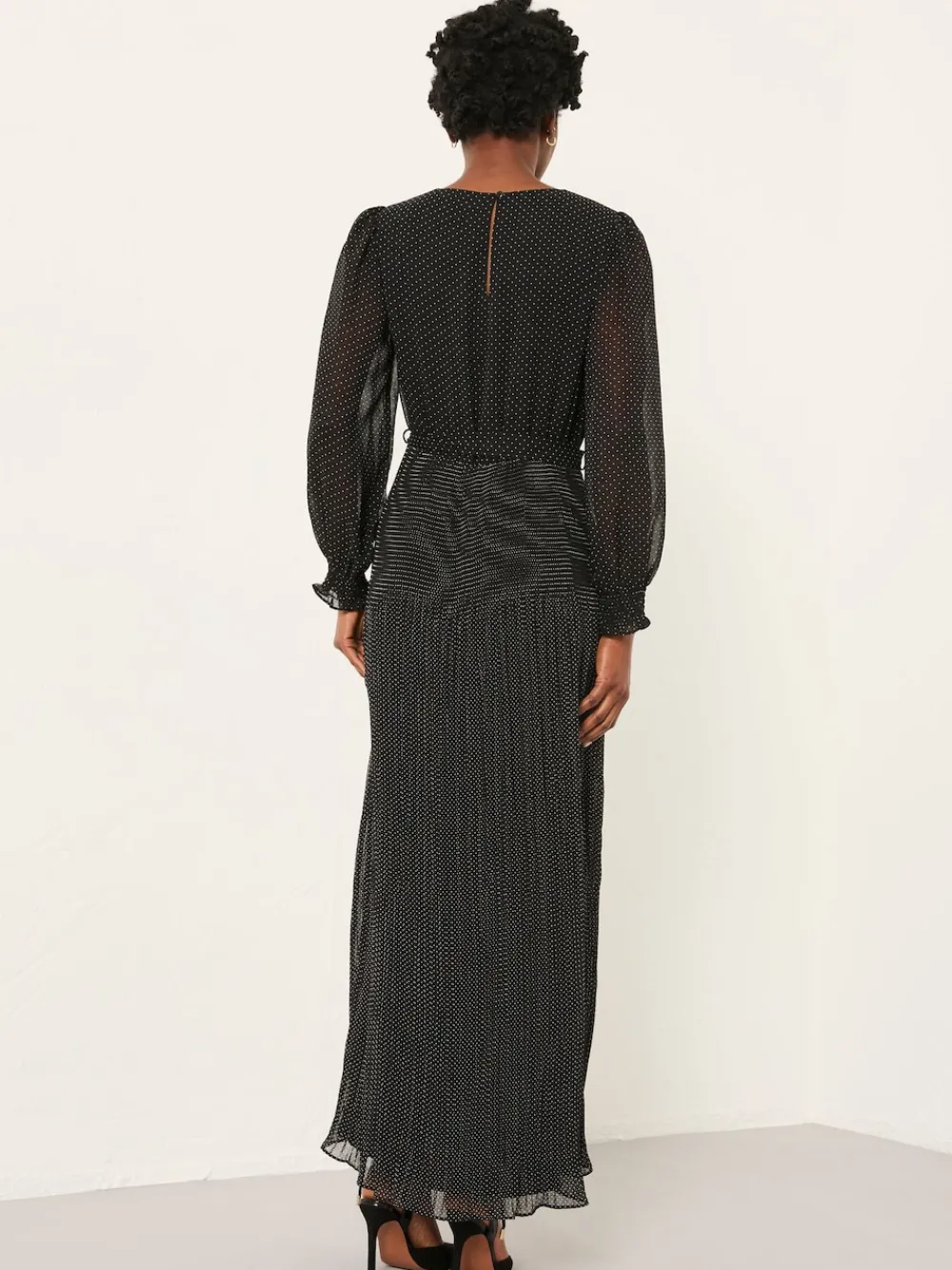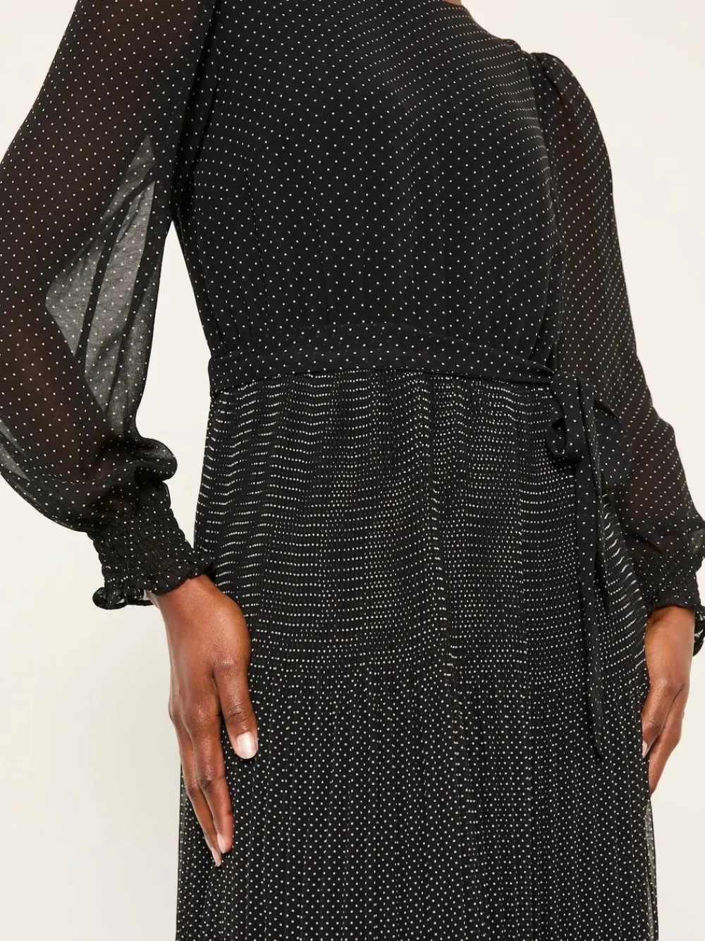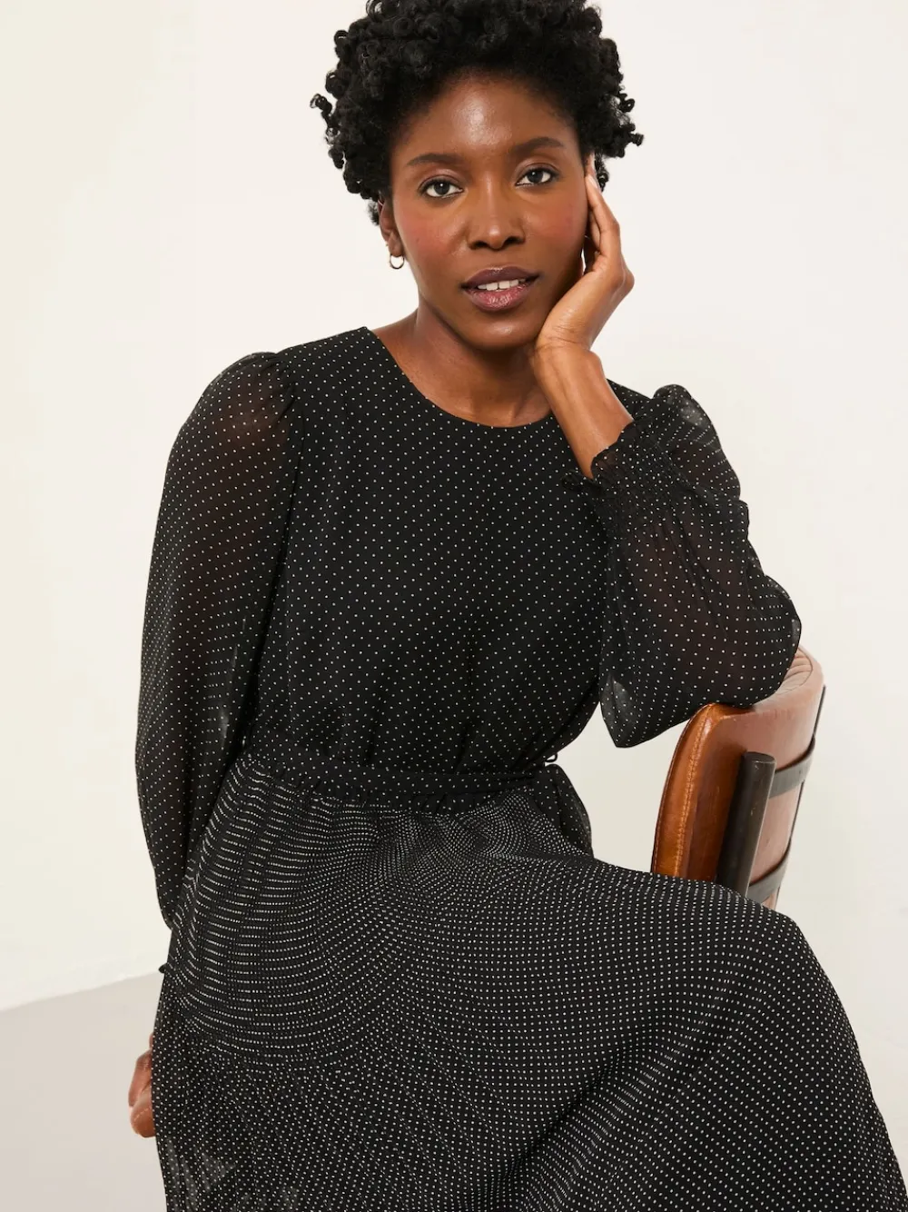 Classic charm meets playful elegance in our Darcy midi dress. This beautifully lightweight chiffon dress features an all-over pin spot pattern, creating a timeless look. Designed with sheer balloon sleeves, a tie waist, and a gently pleated skirt, it’s the kind of dress you’ll reach for when you want to feel effortlessly put together. The soft lining keeps things comfortable, while the sheer overlay adds a floaty, feminine finish. Perfect for everything from daytime events to evening dinners, this dress proves that black doesn’t have to be basic. Regular: 143cm Short: 138cm Machine washable. Shell 100% Recycled polyester. Lining 100% Recycled polyester.