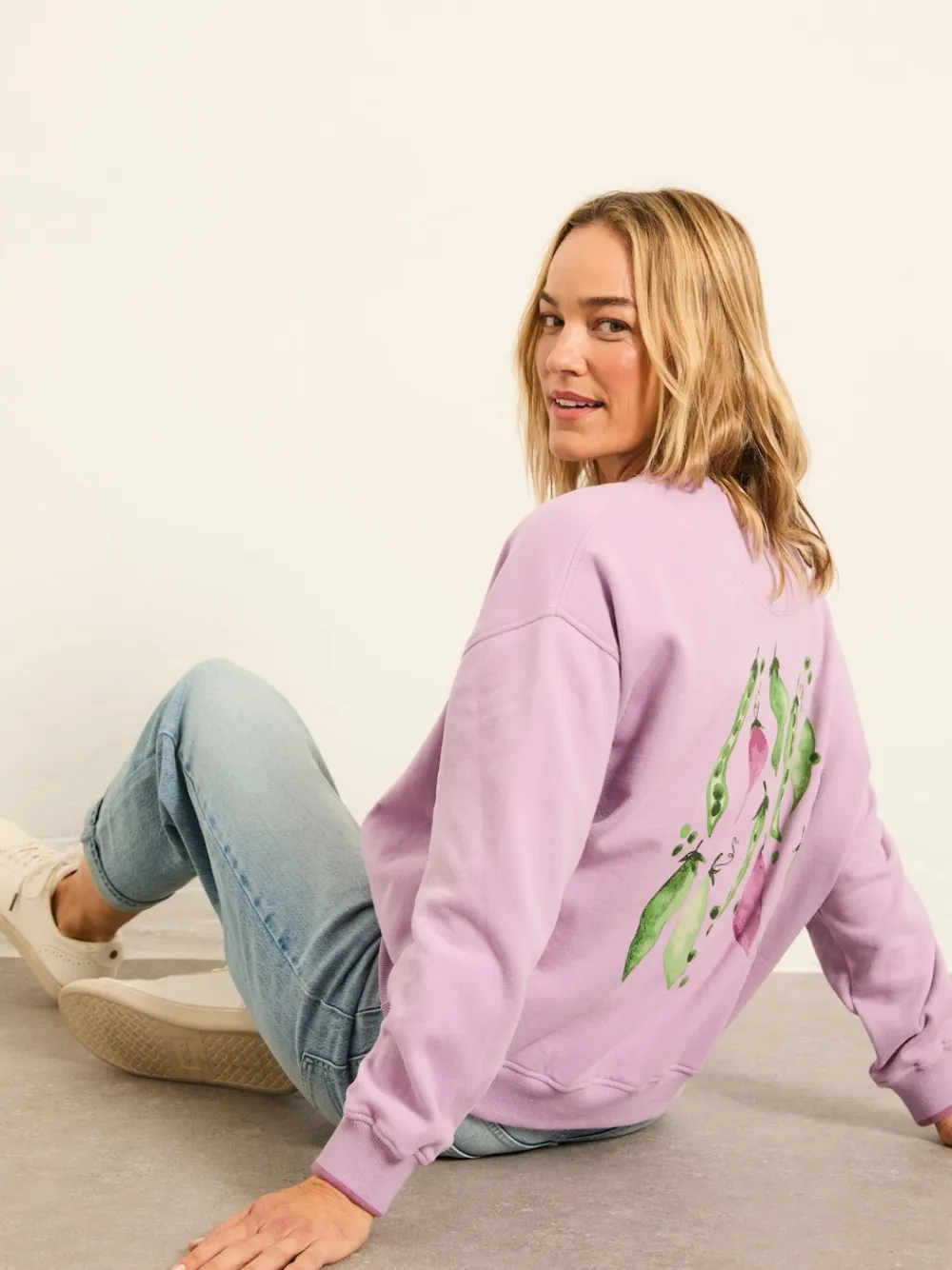 The Emily sweat pea crew sweat features a pea graphic that adds gentle charm to your everyday look. With a relaxed fit, soft fabric, and classic crew neckline, it’s perfect for layering on cooler days or throwing on for laid-back plans. Just add jeans or leggings for a casual feel. Machine washable. Body 89% Cotton, 11% Recycled polyester. Rib 98% Cotton, 2% Elastane.