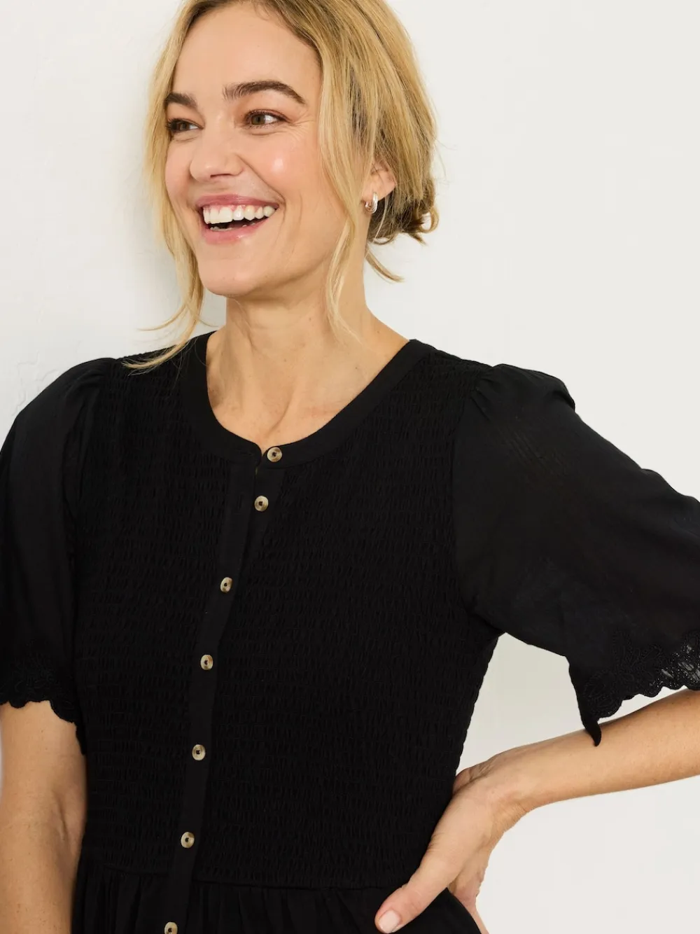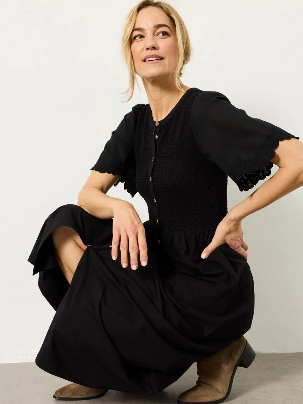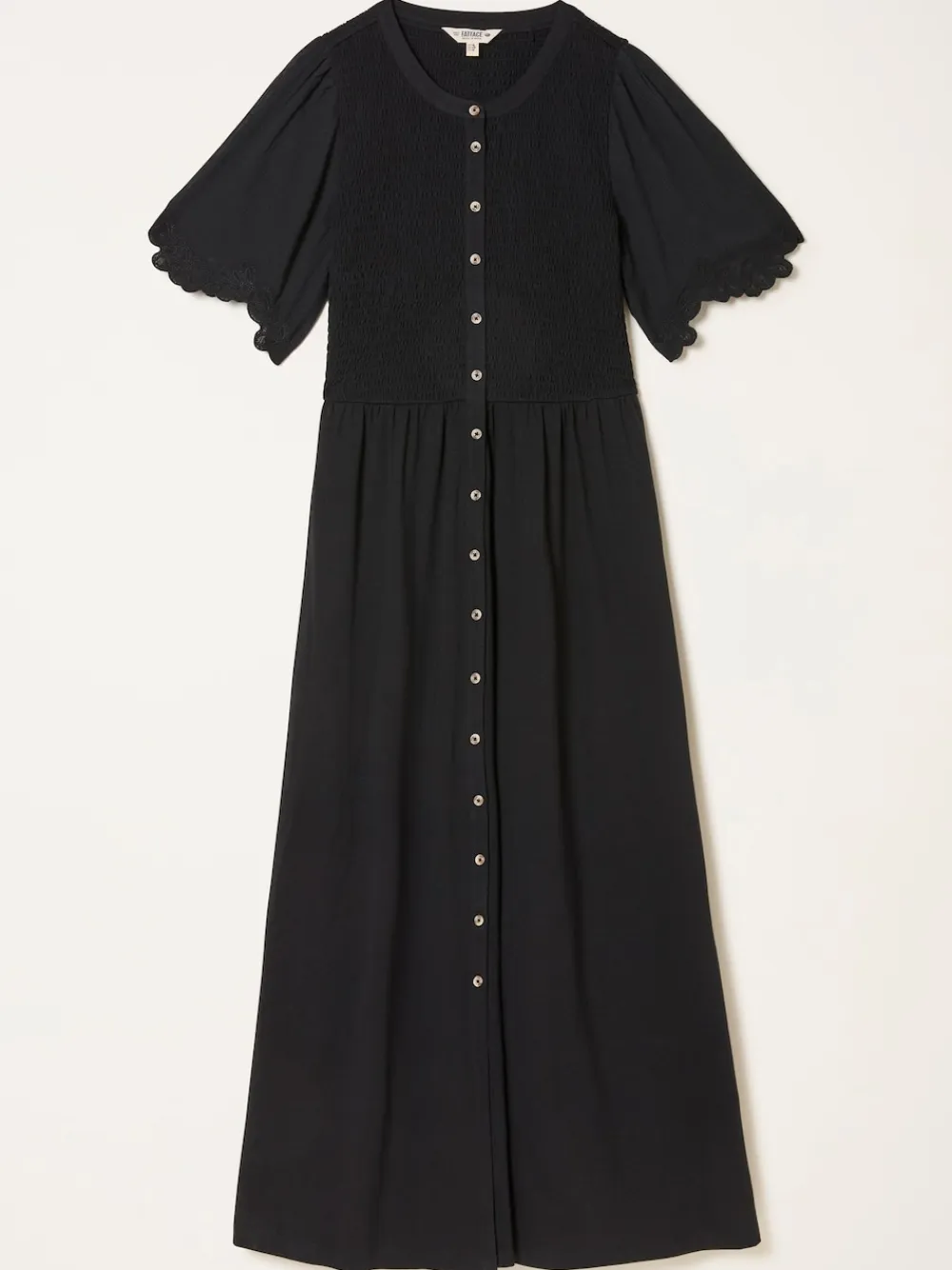 Our Fleur midi dress features a smocked bodice for a flattering, flexible fit and a smooth A-line skirt that flows with ease. The short sleeves are finished with scalloped lace trim for a soft, detailed touch, while the button-down front adds a classic feel. Crafted from lightweight and breathable jersey fabric, it’s an effortless choice for warm-weather plans – just add sandals and go. Regular side neck to hem 45.5″ / 115cm. Machine washable. Main 95% Cotton, 5% Elastane. Panel 100% Cotton. Embroidery 100% Recycled polyester.