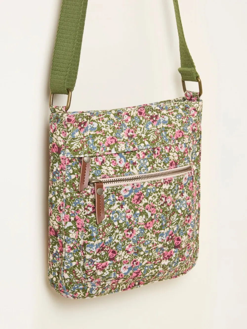 Our canvas crossbody features a sweet ditsy floral print, with a zip closure and adjustable strap for everyday comfort. Just the right size for your essentials – perfect for weekend wanders, coffee catch-ups, or adding a little colour to your day. Height 22.5cm Width 23.5cm Main 100% Cotton. Lining 100% Cotton.