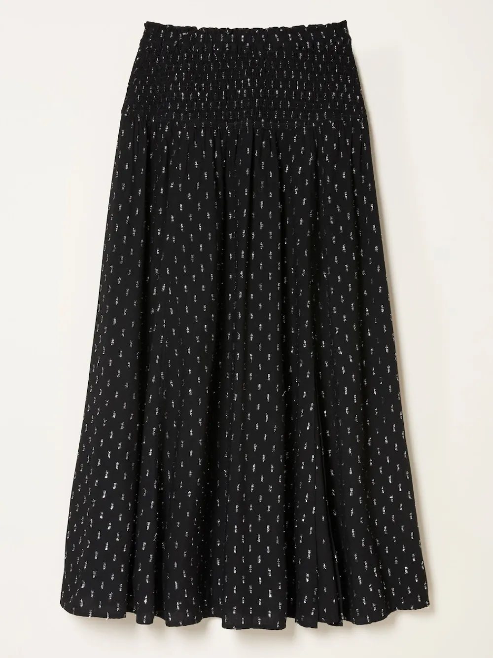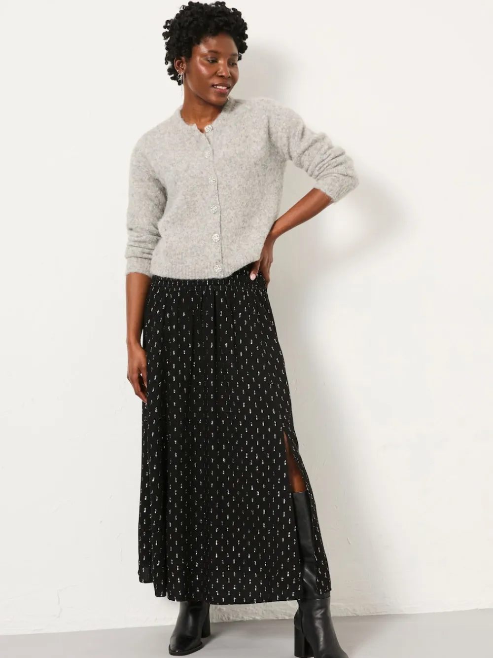 Stand out in style with our Harper midi skirt. Made from soft fabrics, this skirt is comfortable and breathable, ideal for dressing up or down. With a metallic design, a flattering shape and length and a soft feel, it is the perfect transitional piece for your wardrobe. Wear on office days with tights and a blouse or to evening drinks with heels, this skirt is easy to style and look good in. Regular waistband to hem 37.5″ / 95cm. Machine washable. 99% LENZING™ ECOVERO™ Viscose, 1% Metallised fibre.