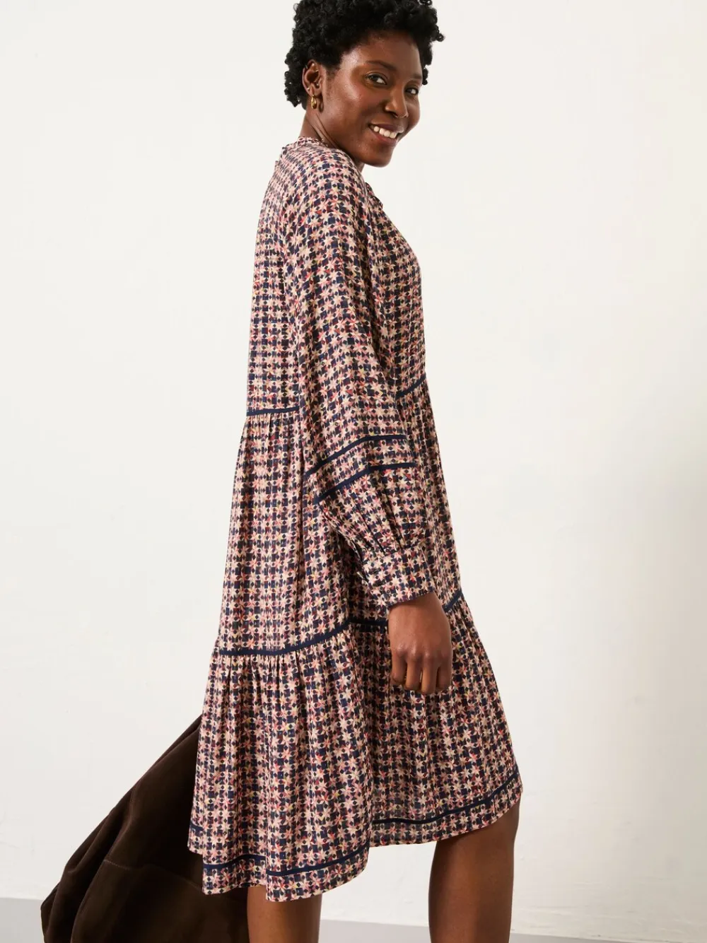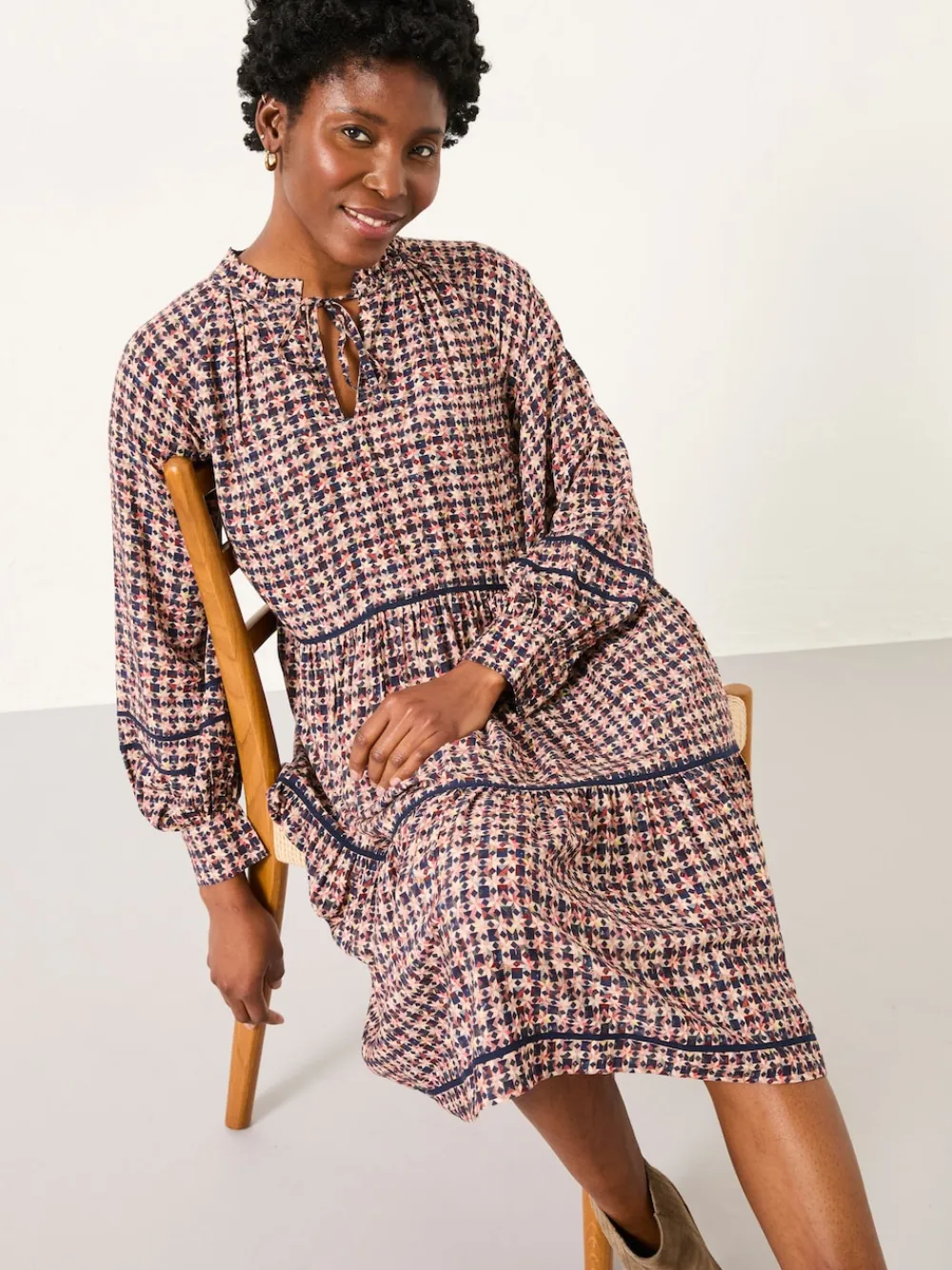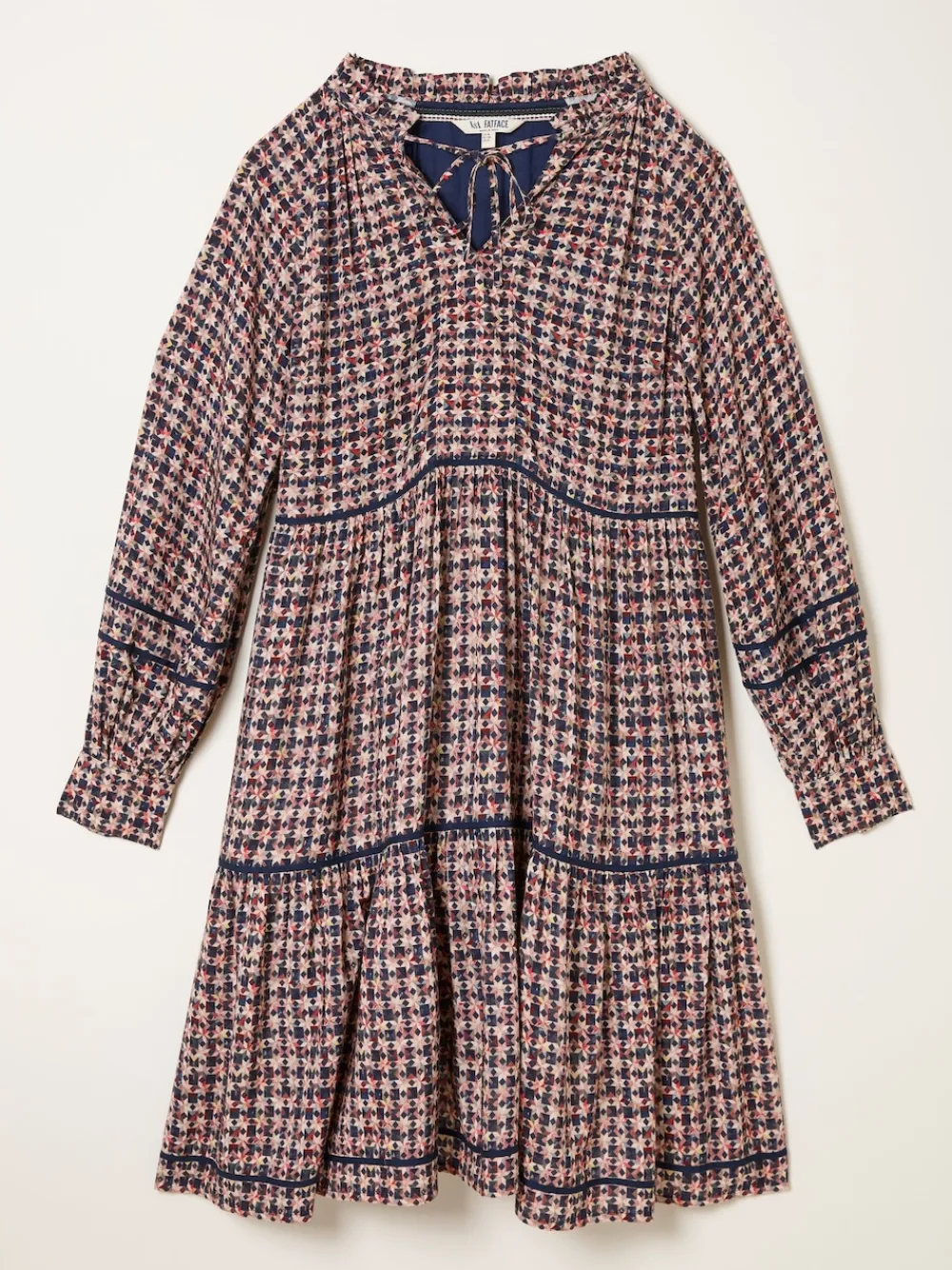 This stirling print dress is perfect for all seasons – wear it with boots and a cardi on chillier days or wear solo with some trainers for weekend coffee runs. Featuring long sleeves, a flattering tie neck and a soft, comfy fabric, the gorgeous print and tiered skirt makes it perfect to elevate your dress rotation. This product is included in our collaboration with the V&A. Inspired by designs held in the V&A’s archives and reimagined by our in-house designers, the V&A x FatFace range celebrates British design, handcrafted techniques and the beauty of the natural world. Regular side neck to hem 36.5″ / 93cm. Machine washable. Main 100% LENZING™ ECOVERO™ Viscose. Lining 100% LENZING™ ECOVERO™ Viscose. Lace 100% Cotton.