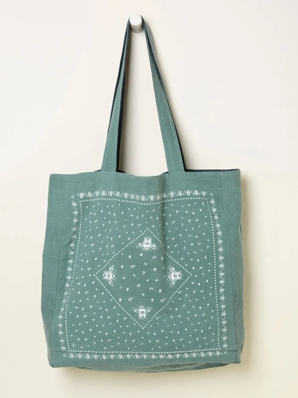 This bee bandana print reversible tote features an all-over bee bandana print on both sides for double the style. Lightweight yet roomy, it’s built for daily carry – whether you’re heading to work, the market, or a weekend away. Height 35cm Width 39cm 100% Cotton.