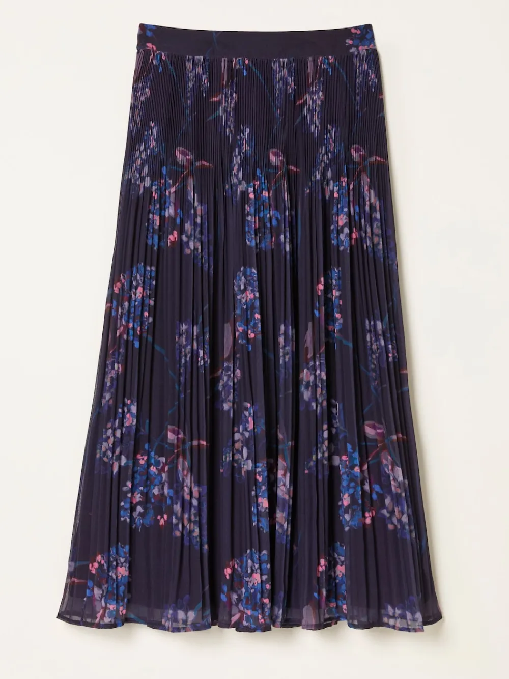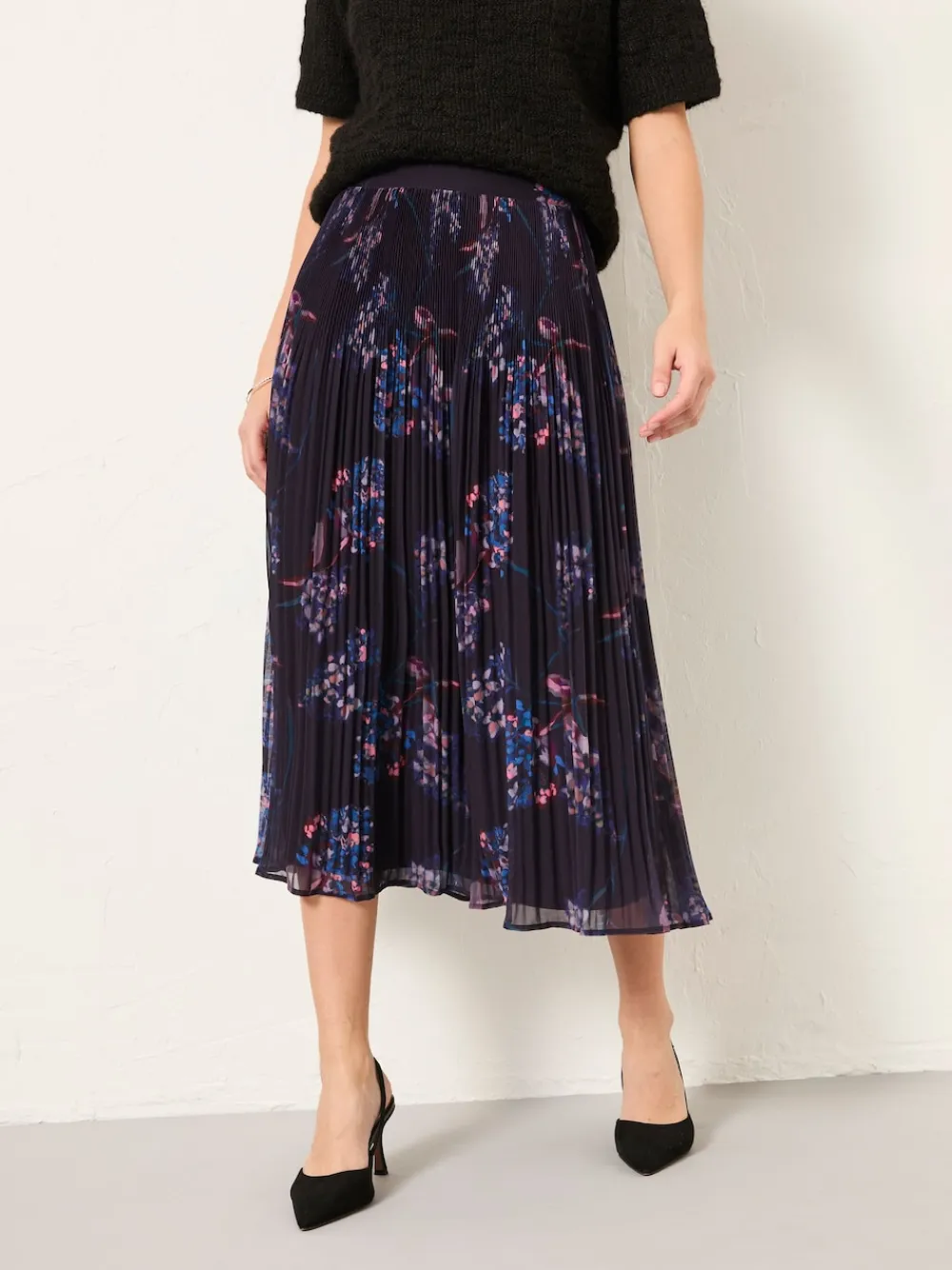 Stand out in style with our Paignton maxi skirt. Made from a soft 100% recycled polyester, this skirt is comfortable and breathable, ideal for dressing up or down. With a pleated design, a purple heritage floral print, a flattering shape and length and a soft feel, it is the perfect transitional piece for your wardrobe. Wear on office days with tights and a blouse or to evening drinks with heels, this skirt is easy to style and look good in. Regular waistband to hem 34″ / 86cm. Machine washable. Shell 100% Recycled polyester. Lining 100% Recycled polyester.
