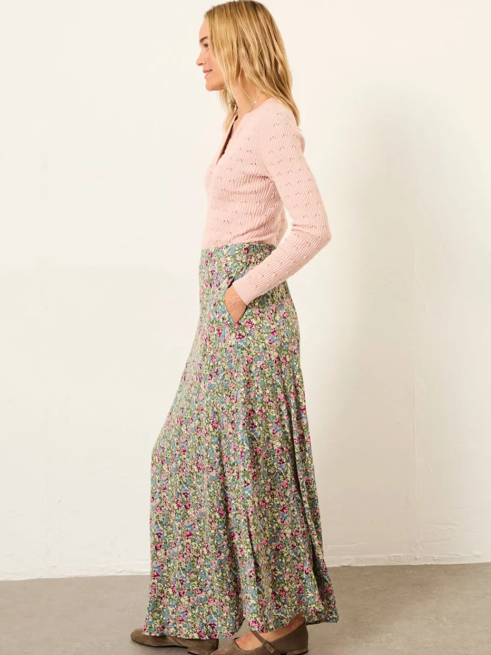 The Sadie midi skirt is crafted from 100% viscose fabric making it light and airy with a soft drape and all-over ditsy print. Designed with a comfortable waistband and easy A-line shape, it’s perfect for sunny days, weekend plans, or dressing up just a little. Simply pair it with a tee, blouse or knit. Regular waistband to hem 35″ / 89cm. Machine washable. 100% Viscose.
