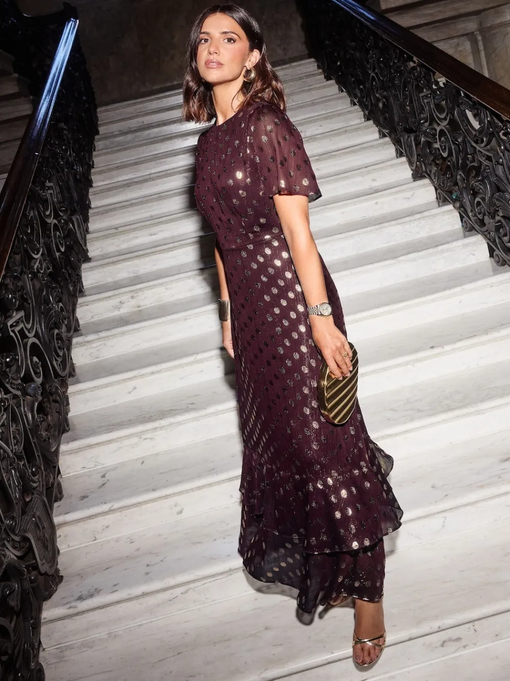 Our beautiful chiffon-based, short-sleeve foil printed maxi dress features short flutter sleeves, a crew neckline, a tiered hem, and maxi length; the perfect stylish and flattering piece for any occasion or event! Wearing length – 142cm. Model size – UK 8. Main 98% Polyester, 2% Metallised fibre. Lining 100% Polyester.