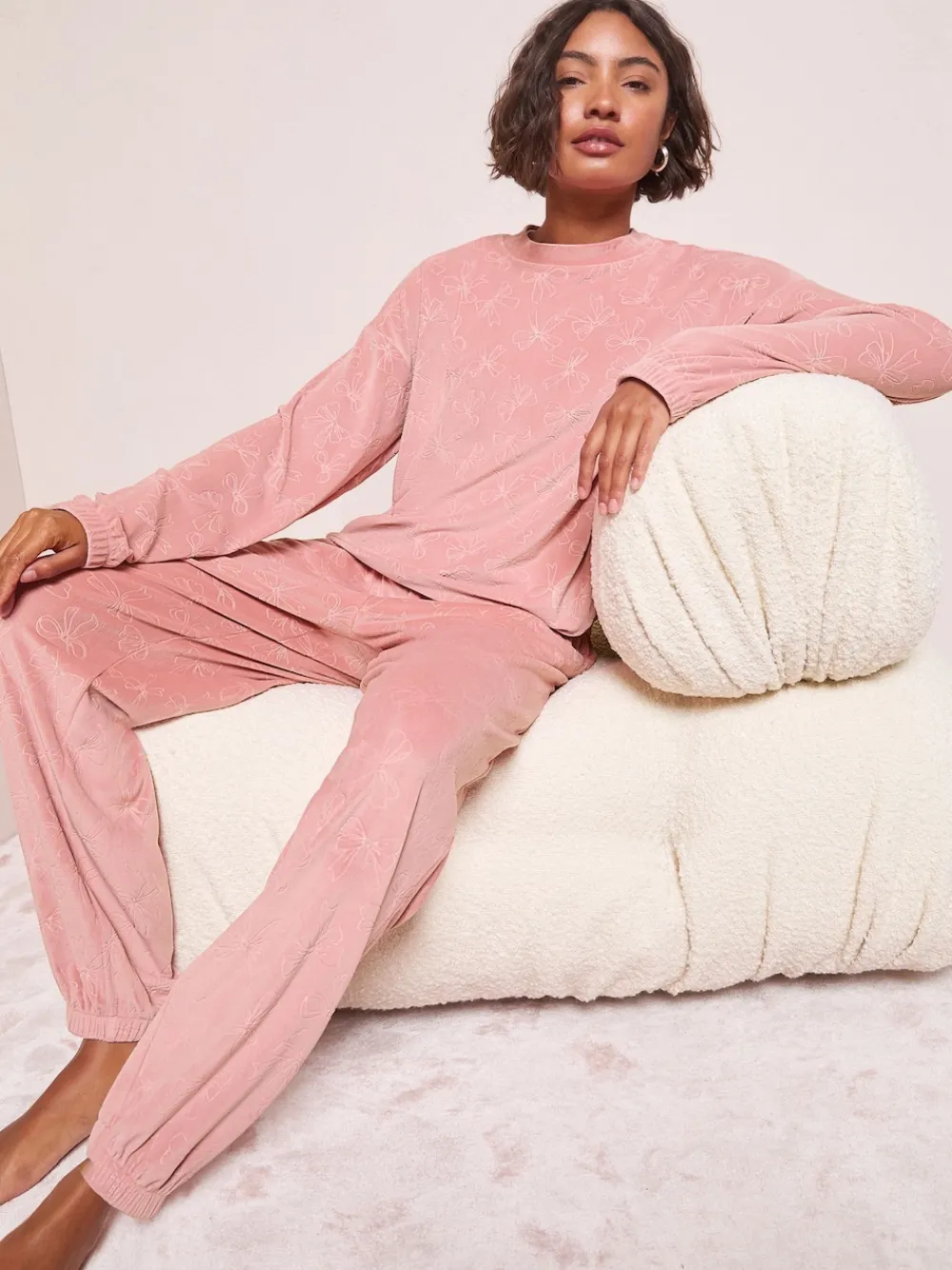 Our bow embossed nightwear set is the perfect blend of comfort and style for your off-duty moments. This cosy two-piece includes a long sleeve top and matching wide leg bottom designed in a soft fabric for a dreamy night’s sleep or lounging in style. Model wears UK size S. 93% Polyester, 7% Elastane.