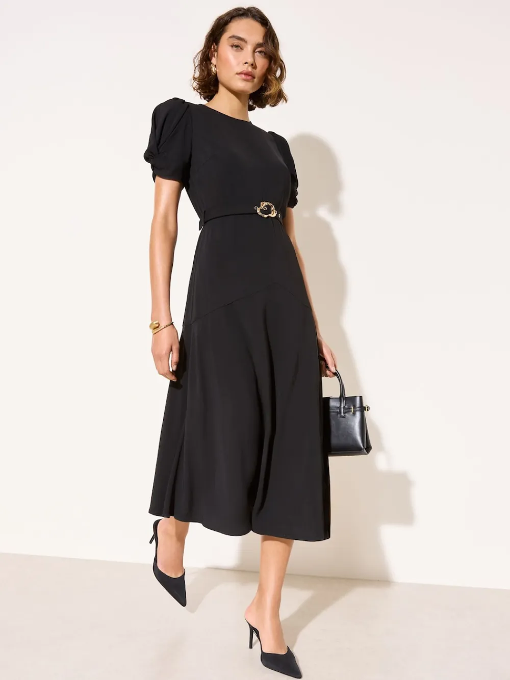 Friends Like These Ruched Short Sleeve Belted Midi Dress Black Sale