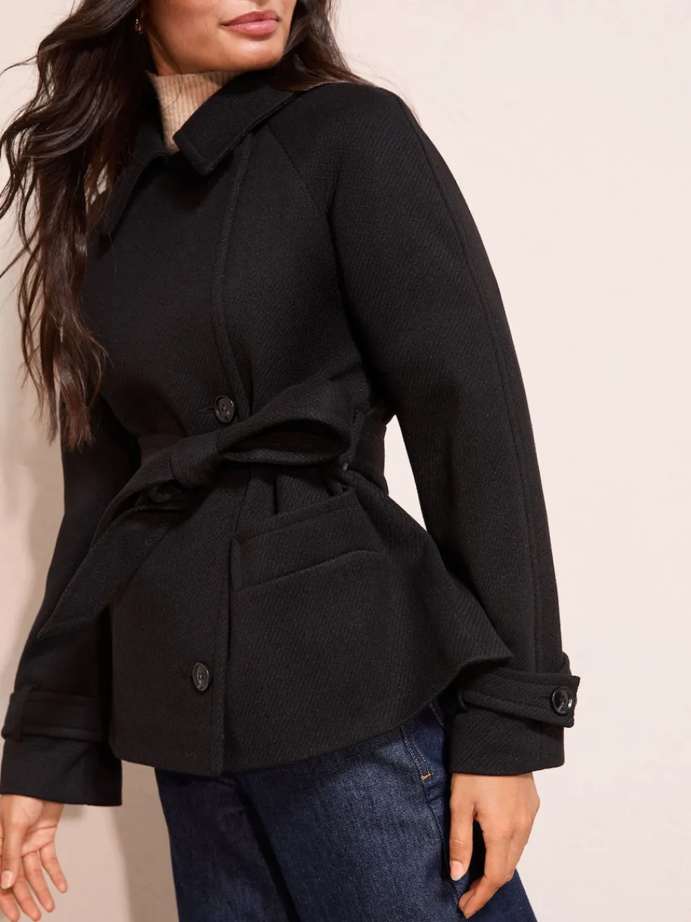 Short twill jacket with a belt design and collar. The perfect smart and versatile jacket for any occasion! Side PocketsFront ButtonsCollared Short JacketButton FrontBeltedModel is wearing a size 8 UK. Main 100% Polyester. Lining 100% Polyester.
