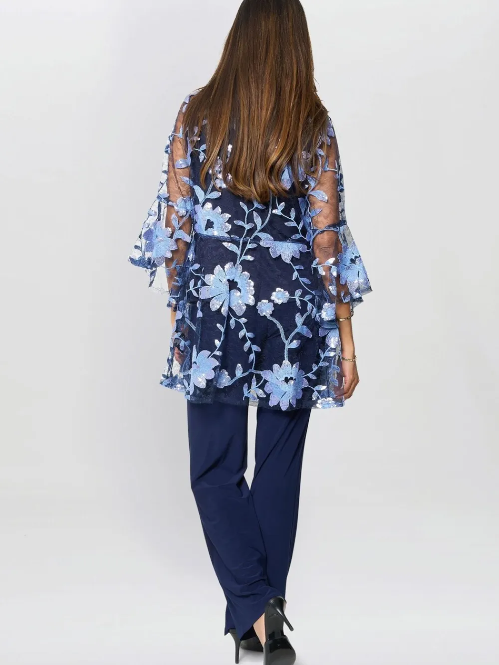 This is a sophisticated ensemble perfect for special occasions. This elegant three piece set features a navy top and matching trousers that offer both comfort and a flattering silhouette. The embroidered jacket has beautiful floral embellishment in shades of blue, adding a touch of charm. Ideal for weddings, evening events, this set blends timeless style with modern elegance. Hand wash only. Main 95% Polyester, 5% Elastane. Lining 100% Nylon. Main Lining 95% Polyester, 5% Elastane.