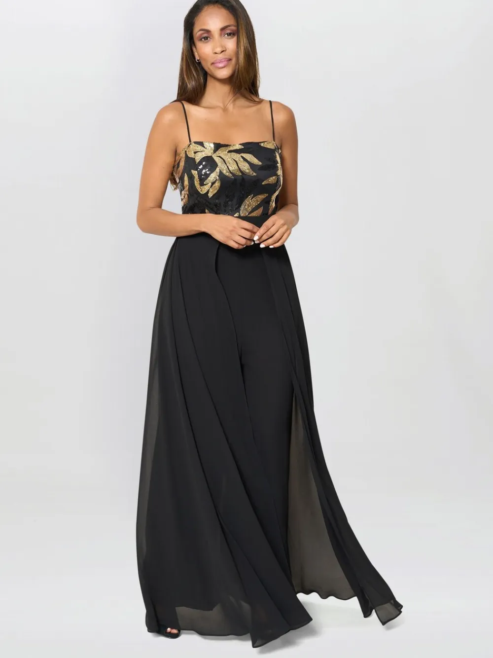 Step into effortless elegance with the new Fannie jumpsuit. Featuring a striking gold floral bodice with a flattering wrap design, this piece flows into wide-leg chiffon-style trousers for a dramatic yet graceful silhouette. This lightweight fabric drapes beautifully, offering both comfort and sophistication. Regular inside leg length 55″ / 140cm. Dry clean only. 100% Polyester.
