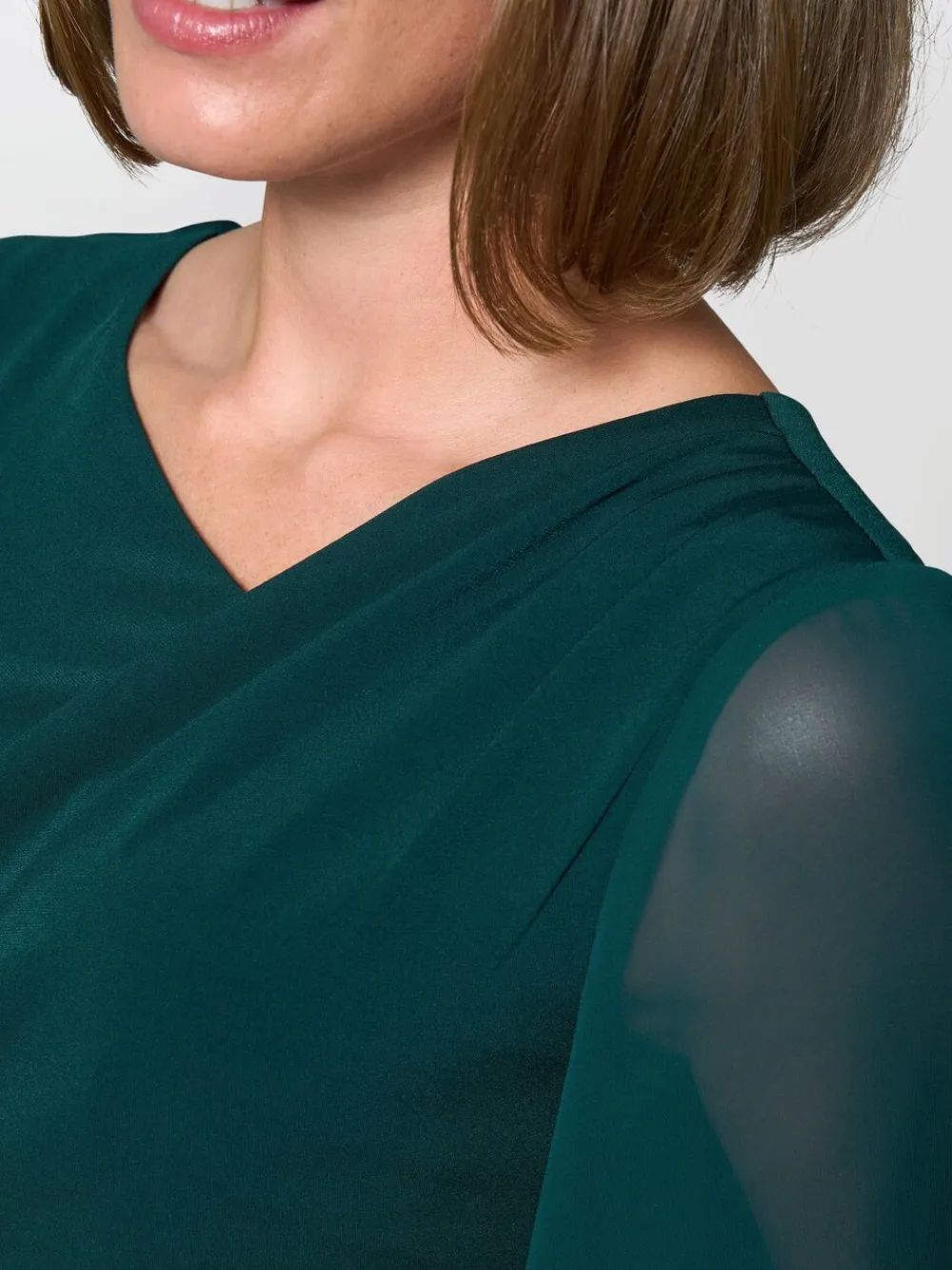 The Donatella maxi dress is a timeless eveningwear choice. In a deep green this maxi dress features a flattering draped silhouette with a soft chiffon cape overlay that adds elegance to every movement. The gathering at the waist enhances the figure, offering a refined and polished look perfect for formal events, weddings or galas……….. Regular side neck to hem 55″ / 140cm. Machine washable. 96% Polyester, 4% Elastane.