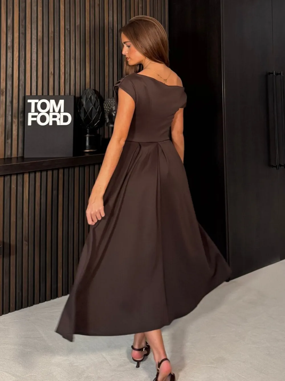 Girl In Mind Brown Betty Asymmetric Neckline Skater Midi Dress Discount