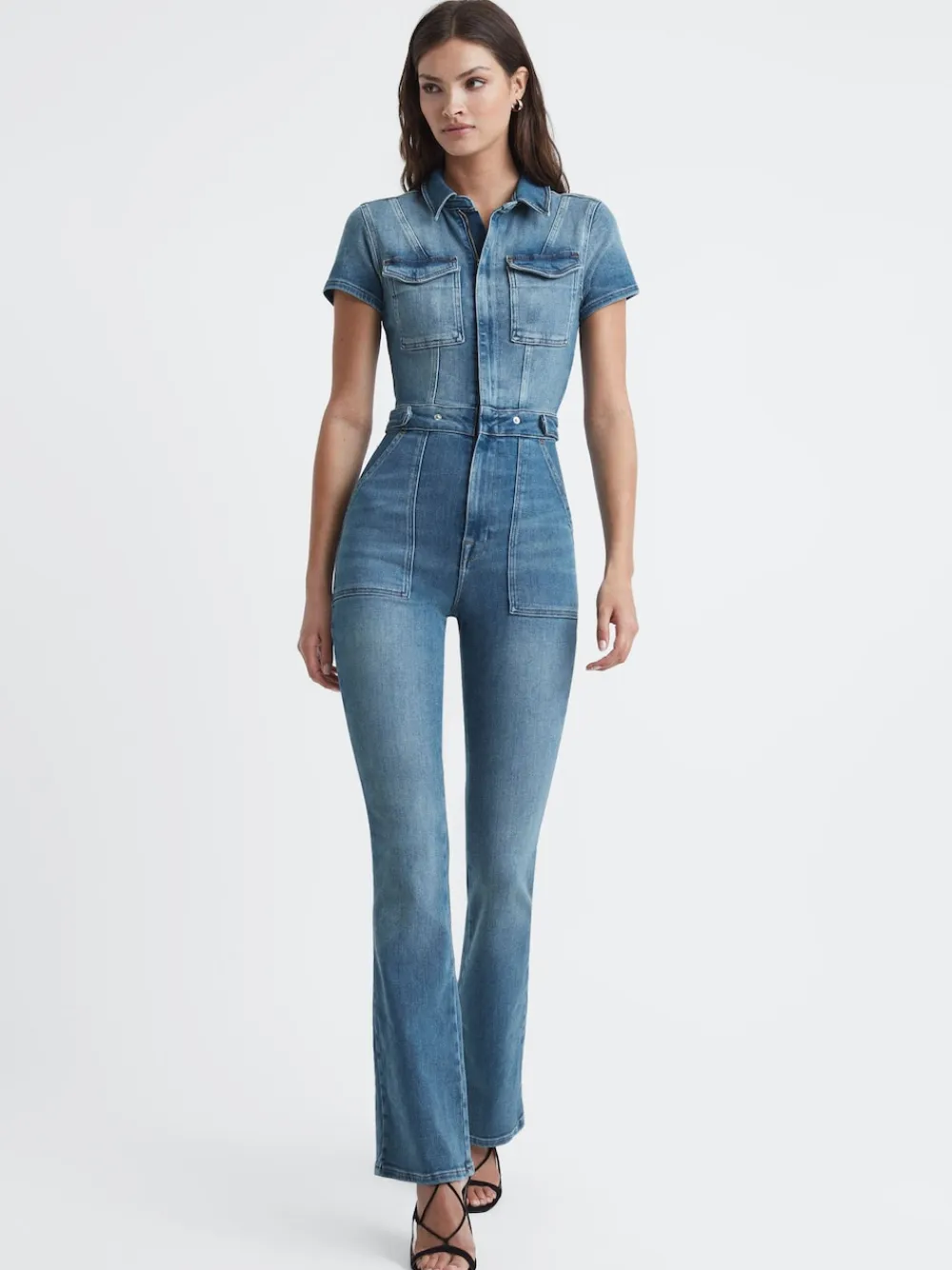 Good American, curated by Reiss, is a collection designed to work perfectly with your existing Reiss wardrobe. Innovative, solution-led denim and lifestyle garments champion inclusivity, enhance curves and represent body acceptance. By women, for women. The Fit For Success Bootcut Jumpsuit is cut from a cotton blend that allows slight stretch for comfort, into a signature palazzo finish. A concealed zip-front closure and classic point collar feature on this jumpsuit. Dual press-stud breast pockets and dual patch side slip pockets add practicality to style, and the sides are purposefully cinched. Select this jumpsuit under your favourite Reiss jacket for ultimate casual-cool. Point collar Dual press-stud breast pockets Concealed zip-front closure Short sleeves Dual patch pockets Dual patch pockets to the rear Press-stud side adjusters Bootcut finish The model is wearing a size S. Measurements of model: 5ft 11.5”/ 181cm. Regular inside leg length 11″ / 28cm. Machine washable. 73% Cotton, 25% Recycled cotton, 2% Elastane.