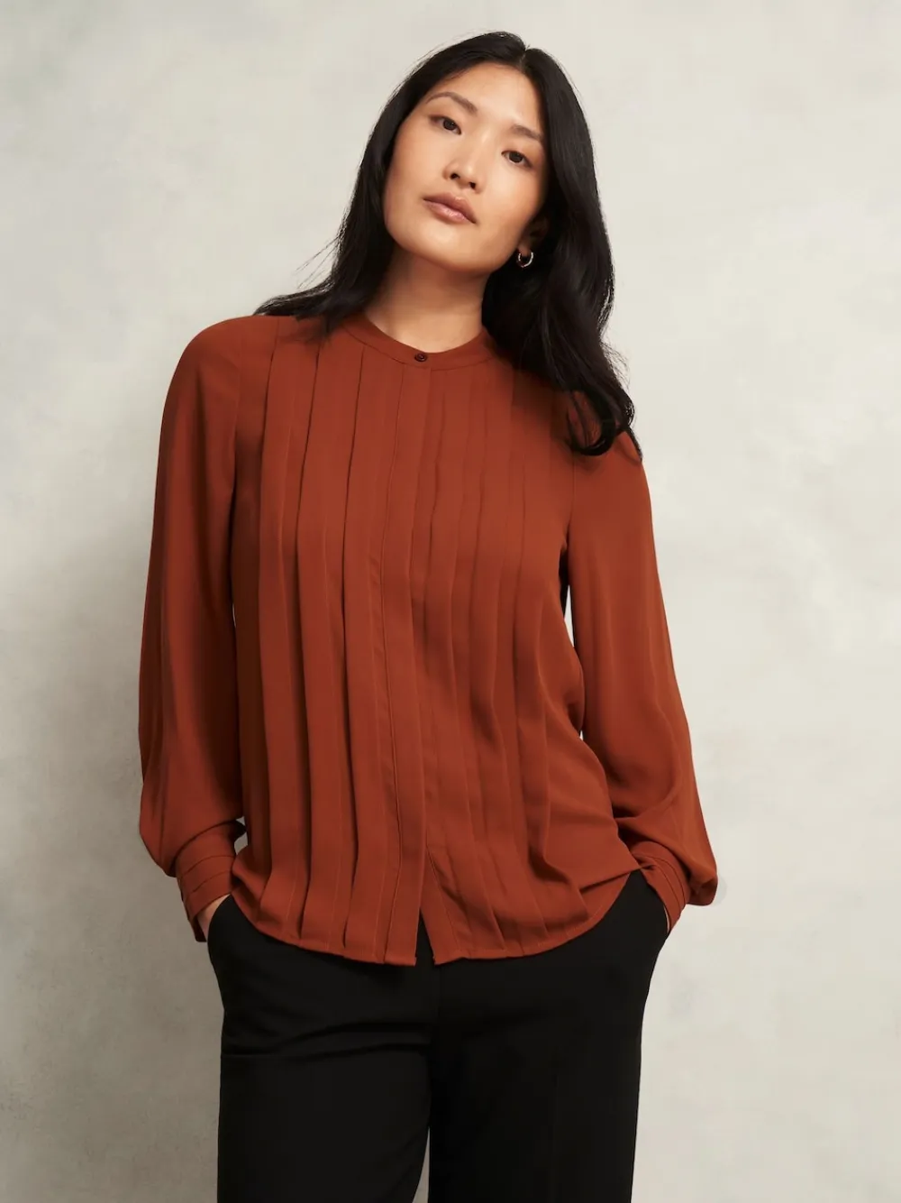 Built with pleats and volume sleeves for a contemporary edge, the Arizona blouse serves a transitional layer for your weekly rotation. Stacked pleats, relaxed fit, concealed button placket, Blouson sleeve, button cuff. 100% Polyester.