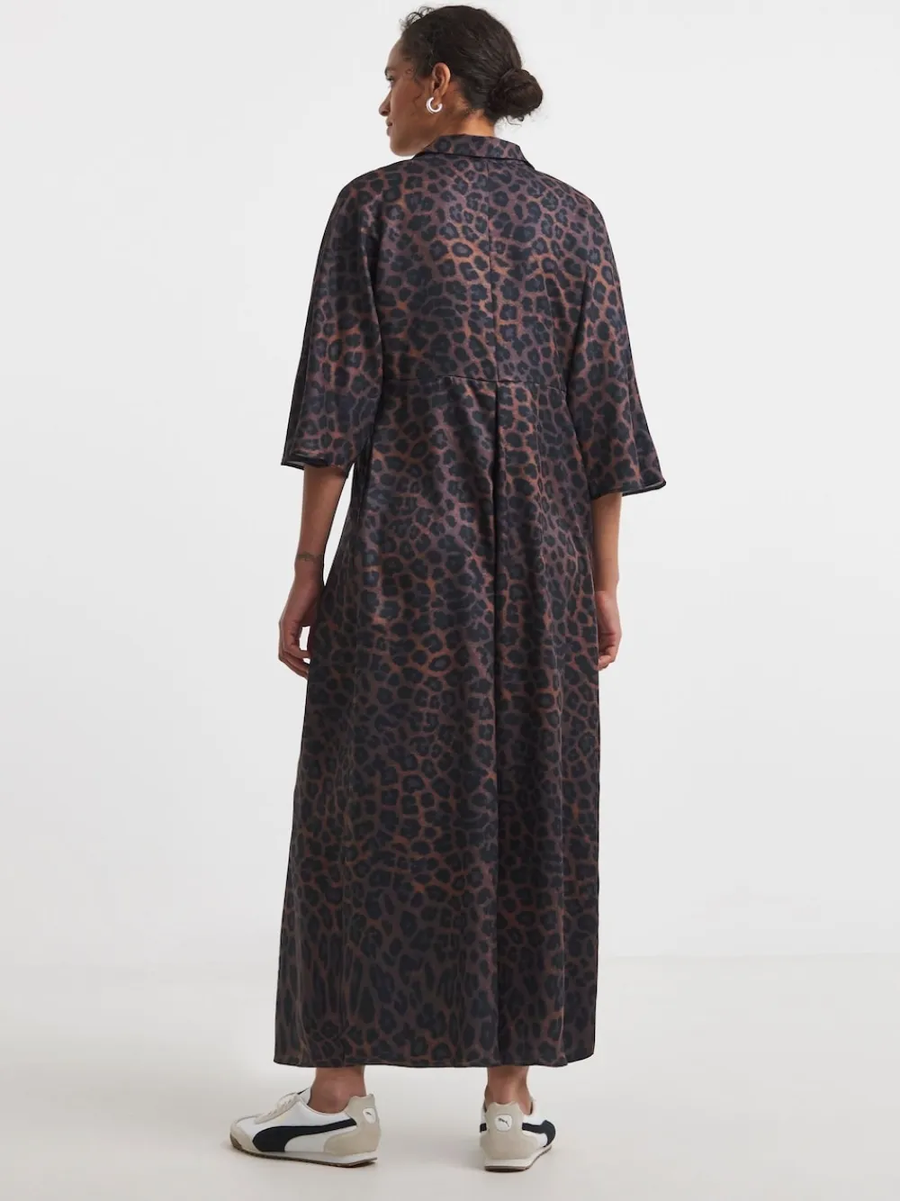 Add our collarless smock midi dress to your wardrobe for a lightweight easy chuck on dress. The dress has been designed in a navy animal print and features include placket details, V -shaped neckline and a maxi length 50 inches. Regular side neck to hem 50″ / 127cm. Machine washable. 100% Polyester.