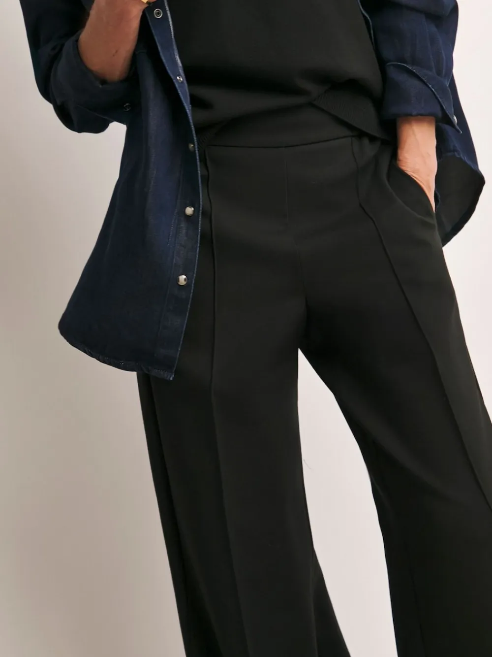 Quality pieces made for everyday, these Anthology Ponte Pull on Wide Leg Black Trousers are cut from a heavyweight Ponte. They are cosy and comfortable with an elasticated waistband for comfort and ease, side pockets for practicality, and pintuck fronts to add sophistication. Also available in Navy. Machine washable. 69% Viscose, 27% Nylon, 4% Elastane.