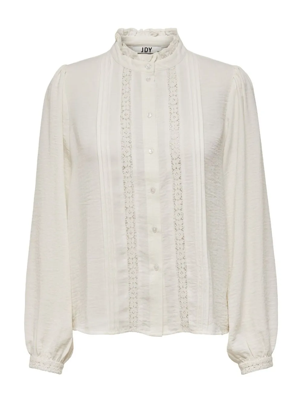 Add soft colours and subtle details to your wardrobe with a feminine shirt easy to pair with timeless jeans or a tailored skirt. Woven fabrics are created by weaving together two or more yarns for a timeless look. JDY is a full-concept, international fashion brand offering affordable and on-trend products to the consumer. Product Type: Shirt Neck: Shirt collar Sleeve: Long sleeves Sleeves: Volume sleeves Cuffs: Buttoned cuffs Closing: Button fastening Extra details: Lace detail, Frills Fit: Regular Fit Machine washable. 100% Polyester.