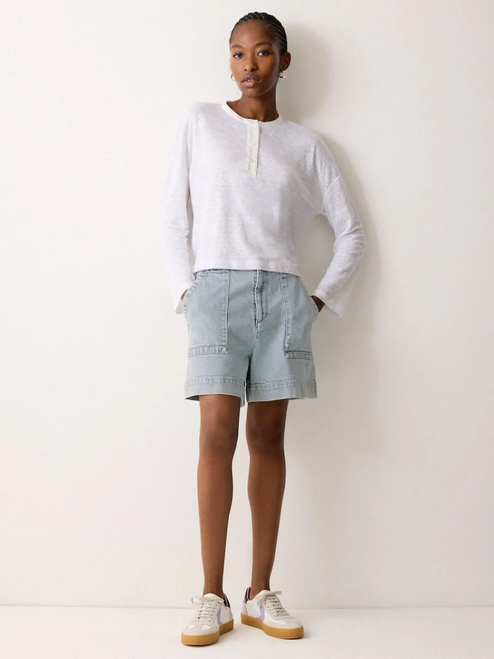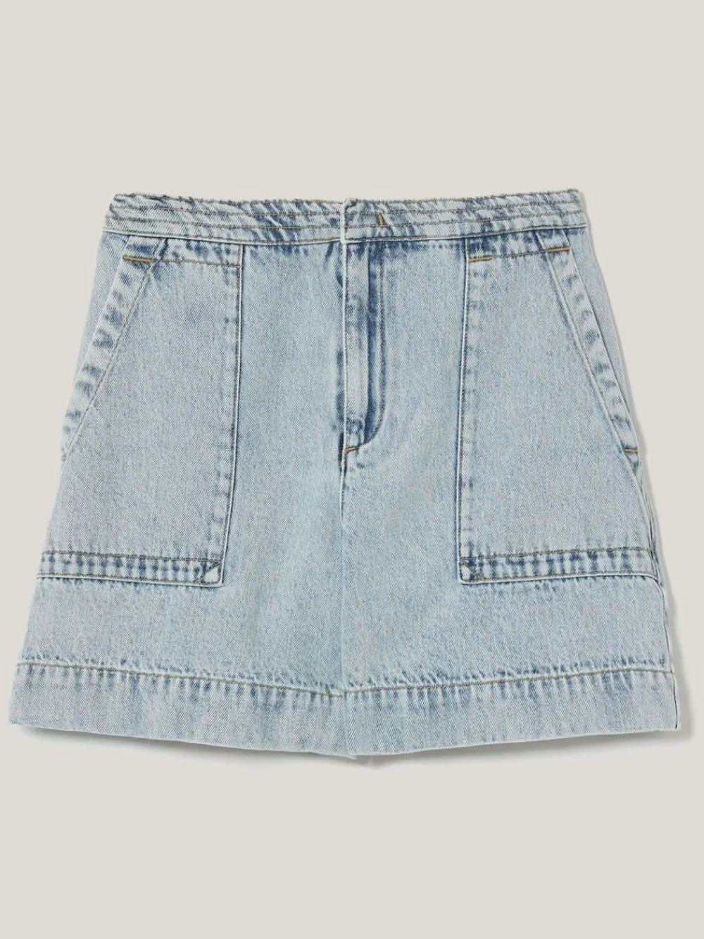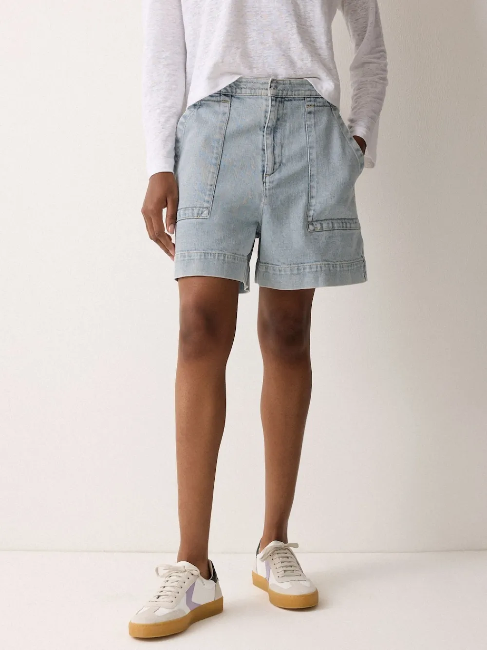 Crafted from pure cotton denim, these high-waisted shorts feature an elasticated waistband for optimal comfort. Front and back patch pockets, along with heavy topstitching details, contribute to both functionality and a distinctive aesthetic. Positioned as the ultimate go-to shorts, their carefully considered length ensures a modest yet versatile appeal suitable for various occasions. Regular inside leg length 15″ / 38.5cm. Machine washable. 99% Cotton, 1% Elastane.