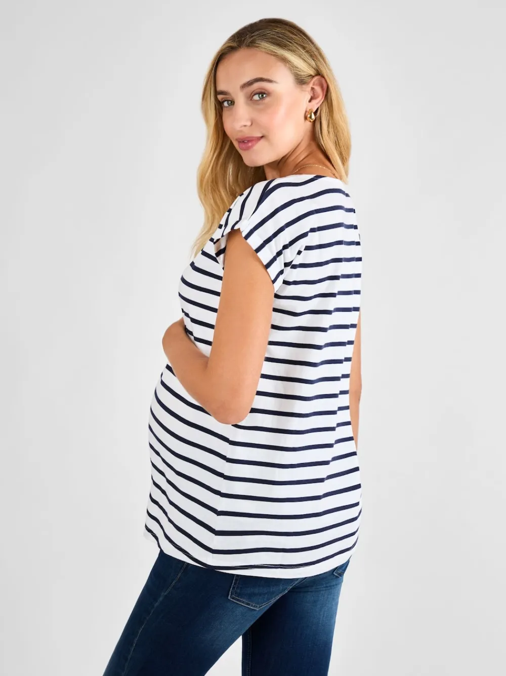 You can never have too many great basics. Our quality White and Navy Stripe Boyfriend Cotton Maternity T-Shirt is the ultimate everyday piece that keeps your style feeling like you, just with a little more room to grow. The relaxed boyfriend fit, round neckline, and short sleeves with turn-back cuffs make it a go-to for every trimester. Pair it with your favourite maternity jeans, soft trousers, shorts, or layer it under dungarees – it’s the perfect starting point for countless comfy, effortless looks. Designed to fit throughout pregnancy White and navy stripes Relaxed jersey fit for growing bump Round neck Short sleeves with turn-back cuffs Machine washable Machine washable. 100% Cotton.