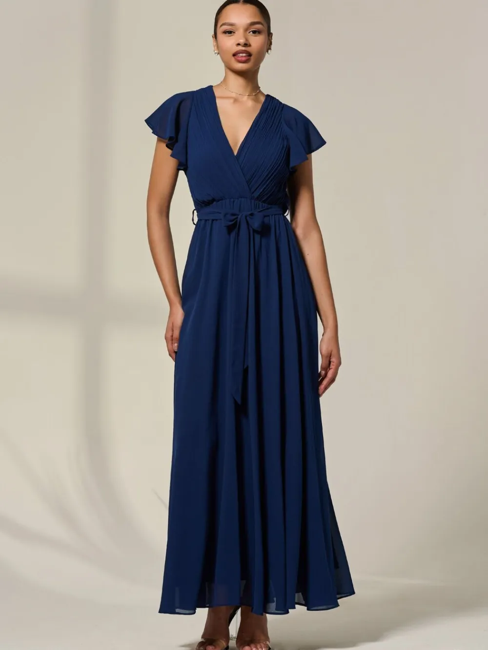 Make every moment unforgettable with the Chiffon Flutter Sleeve Maxi Dress by Jolie Moi. Flowing to a maxi length, the soft, pleated bodice with angel sleeves gently shapes your figure, while the front tie belt cinches the waist for a flattering silhouette. The soft chiffon fabrics cascades beautifully down the body, for a breathable, comfortable fit, perfect for special moments. This versatile dress will make you feel as radiant as the occasion itself. Model height- 170cm and wears a size 8, length 150cm. Machine washable. 100% Polyester.