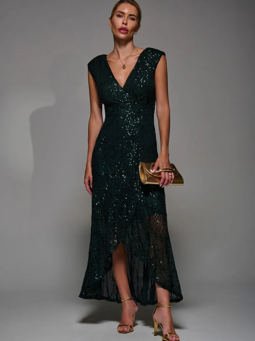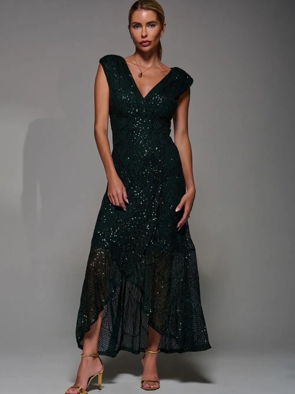 Be the first to review “Jolie Moi Dark Green Sequin Asymmetric Ruffle Hem Maxi Dress New” Cancel reply