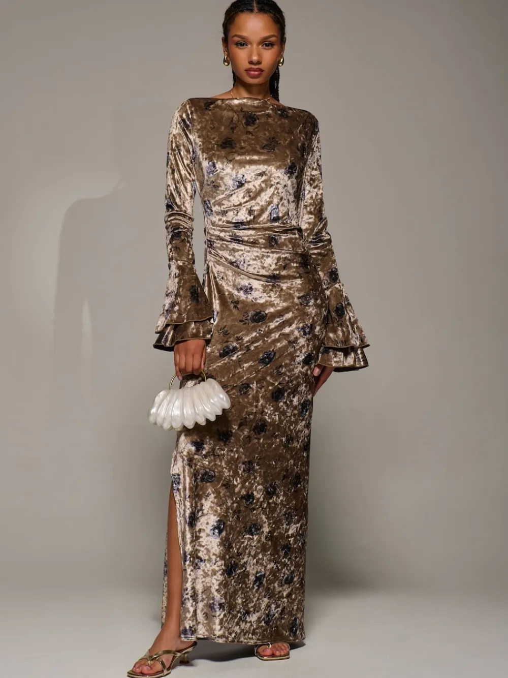 Be the first to review “Jolie Moi Gold Ruffle Sleeve Asymmetric Neck Velvet Maxi Dress Sale” Cancel reply