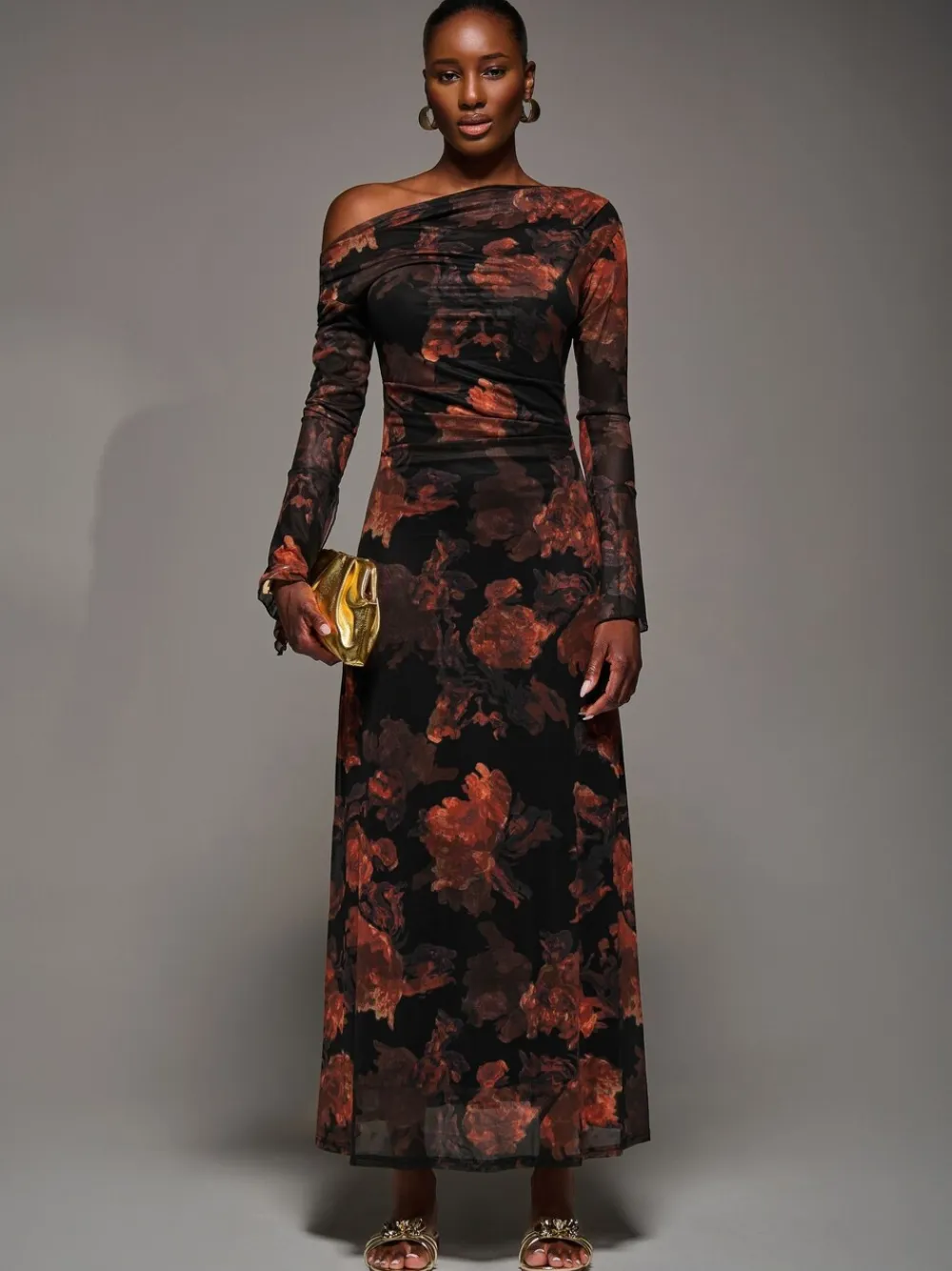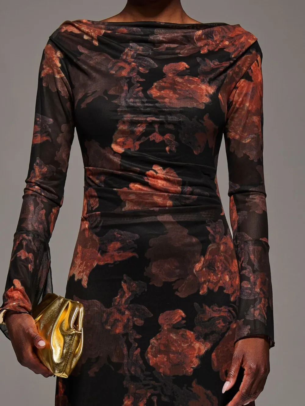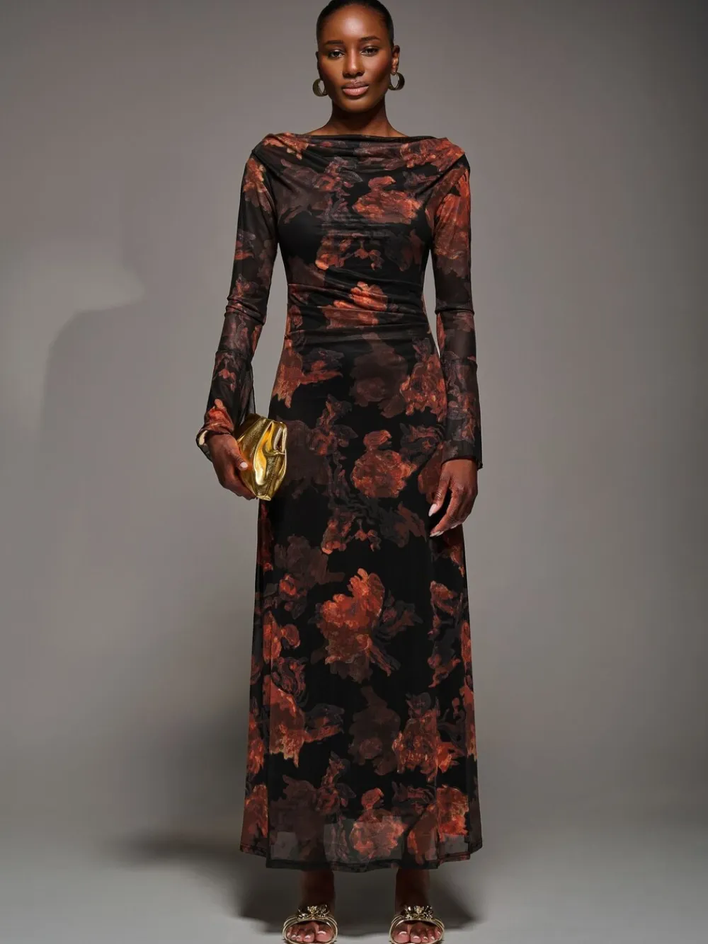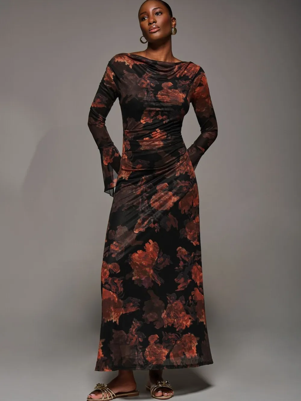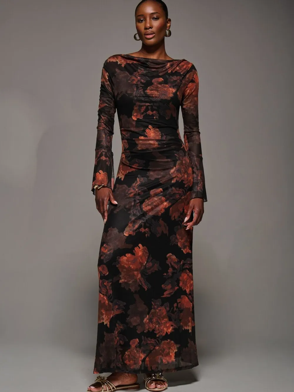 Exude effortless chic in the Long Sleeve Slash Neck Maxi Dress from Jolie Moi, perfect for your next autumn-winter wedding. Adorned in a gorgeous abstract print that cascades over soft airy mesh fabric, this is the dress of the season. Featuring a flattering slash neckline that also has a slight cowl to it, and ruched waist detailing, this dress provides shape and comfort being fully lined with soft jersey fabric. The flared asymmetric sleeves with split detailing add a fun feminine feel to this over-the-head style, ready for the new season ahead. Regular side neck to hem 55.5″ / 141cm. Machine washable. 95% Polyester, 5% Elastane.