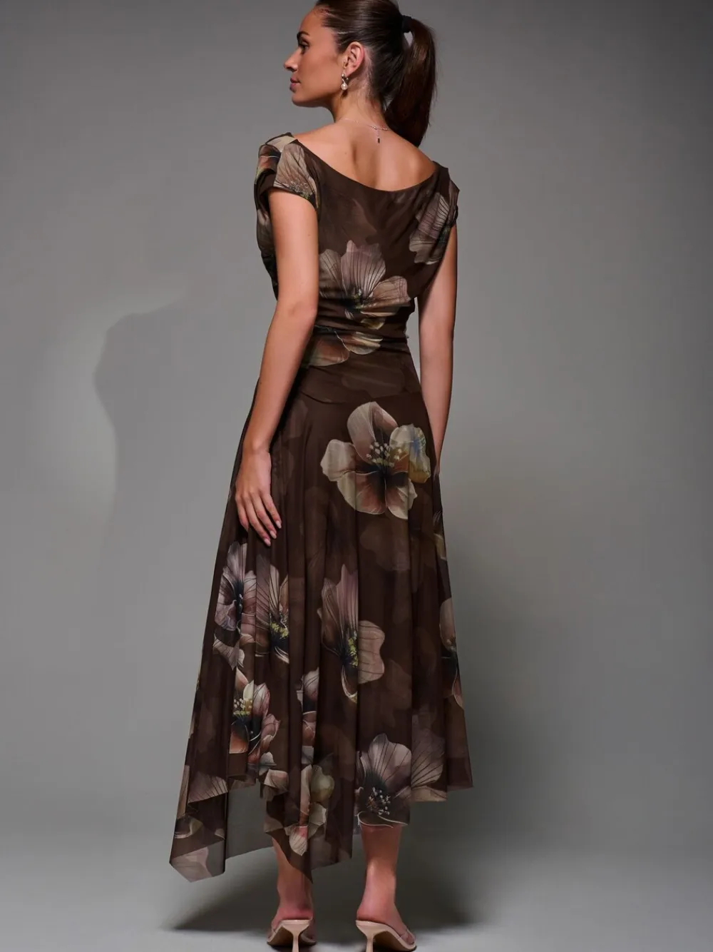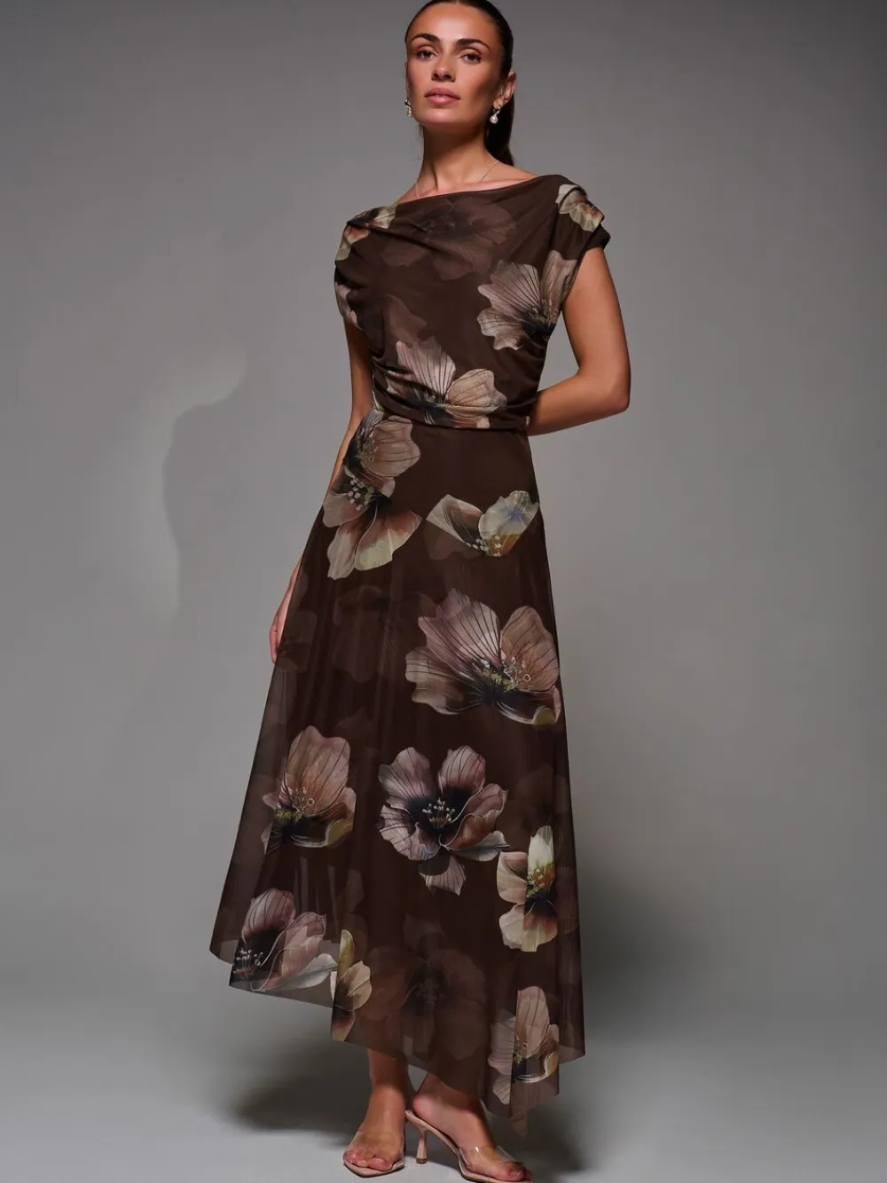 Jolie Moi Mesh Asymmetrical Draped Maxi Dress Light Brown Discount
