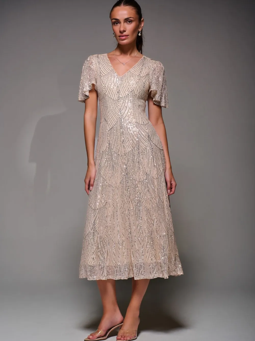 Jolie Moi Nude Sequin Angel Sleeve Fit & Flare Midaxi Dress Online