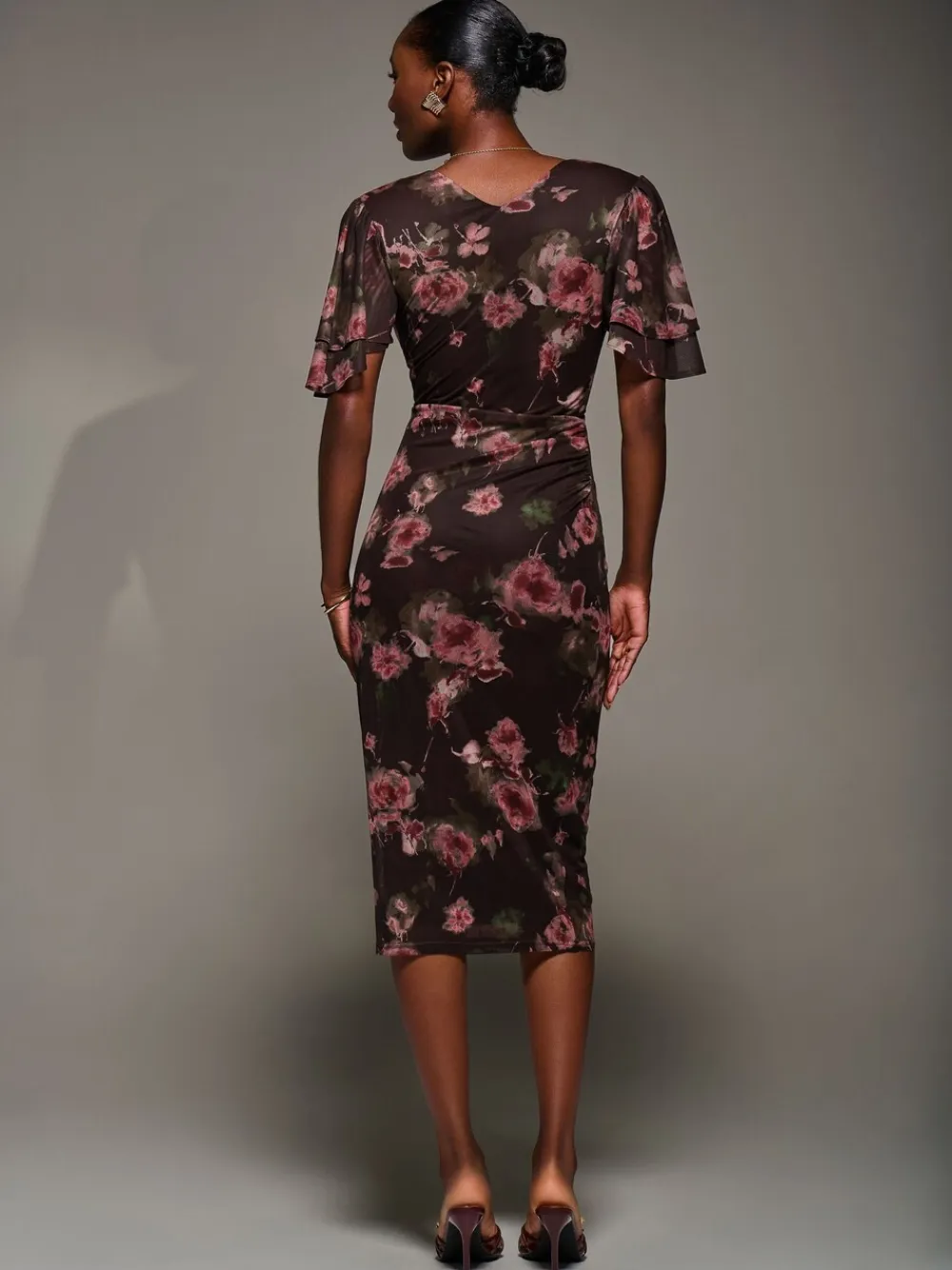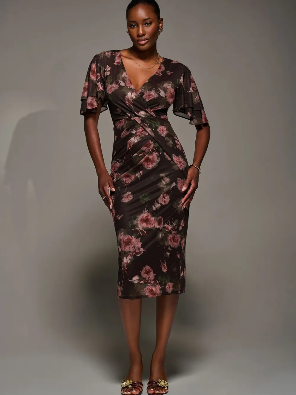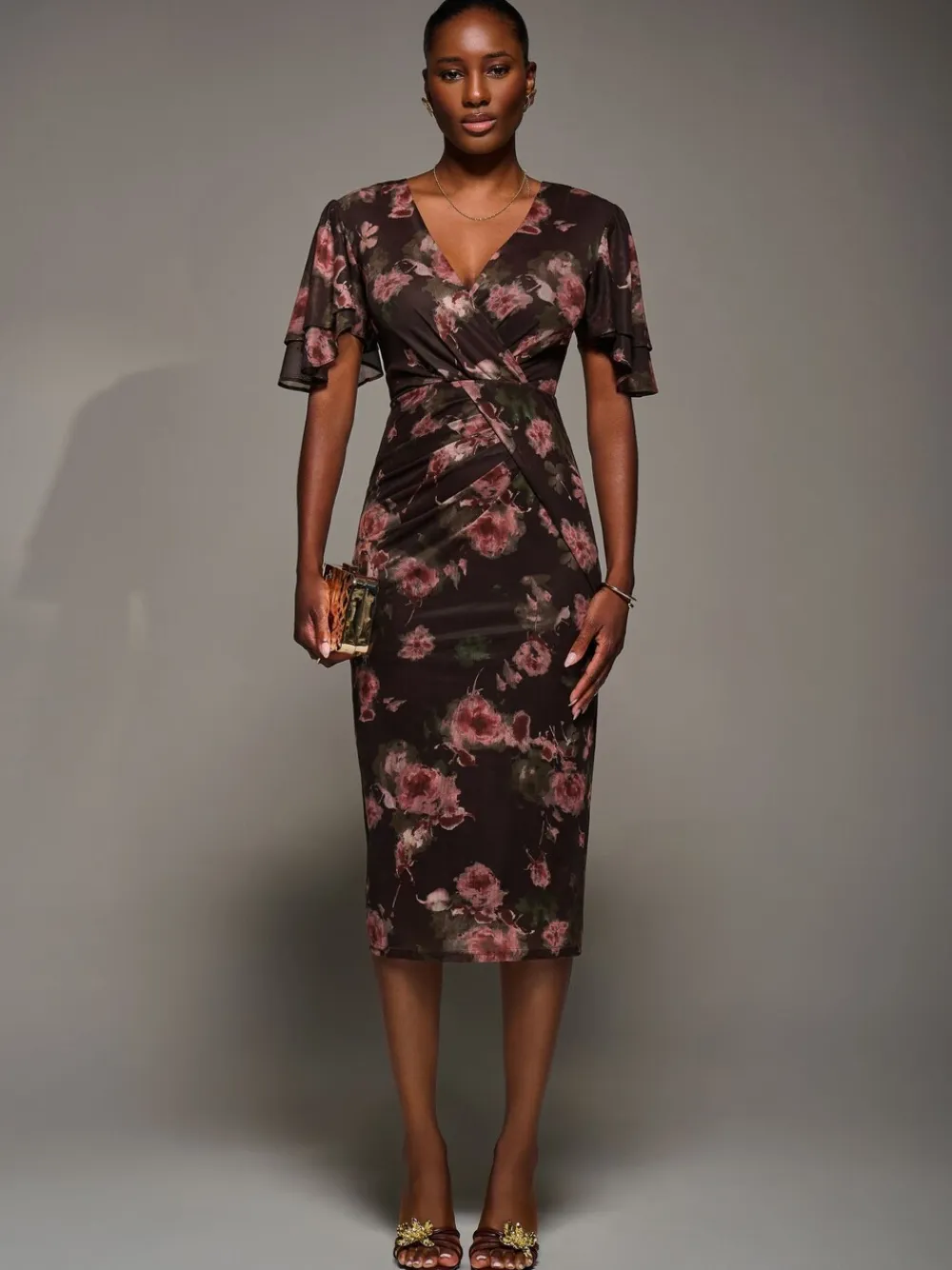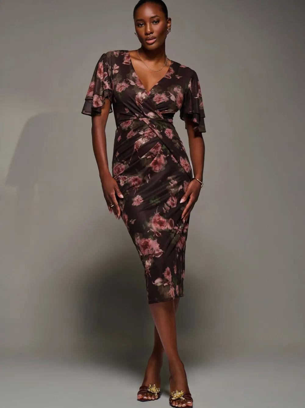 Turn heads in the Print Mesh Angel Sleeve Bodycon Midi Dress by Jolie Moi. Featuring soft stretch floral mesh, a flattering V-Neckline, flowy short angel sleeves with double-tiered detailing, and a wrap front with draped detailing that beautifully shapes the silhouette. Machine washable. 95% Polyester, 5% Elastane.