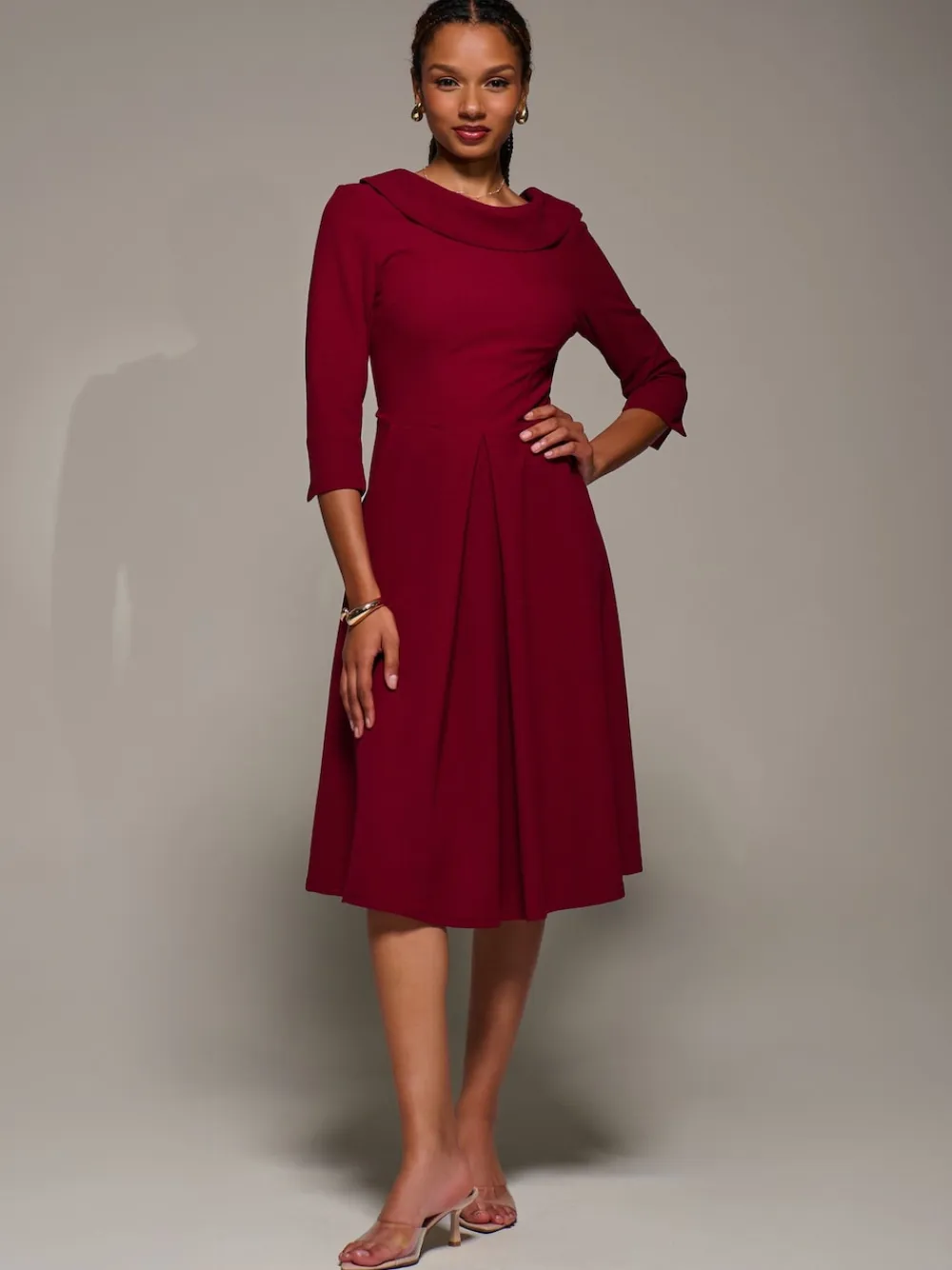 The Roll Neck Fit & Flare Midi Dress from Jolie Moi features a chic roll neckline, three-quarter length sleeves, and a flattering fit-and-flare silhouette. The pleated midi skirt adds graceful movement, while discreet side pockets and a concealed zip complete the elegant look. Machine washable. 97% Polyester, 3% Elastane.