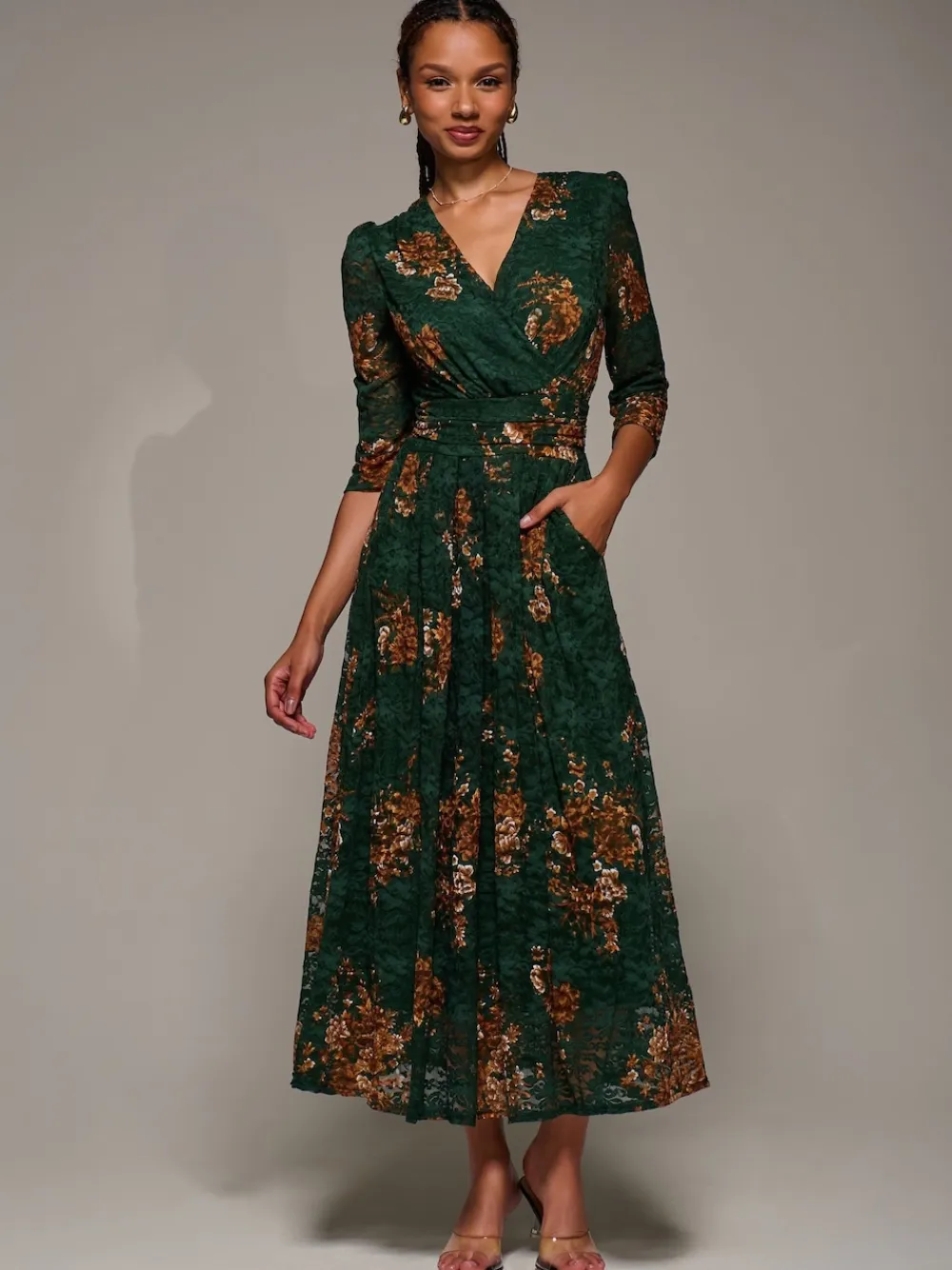 Three Quarter Sleeve Printed Lace Maxi Dress by Jolie Moi features a flattering wrap-front V neckline, a concealed zip at the back for a seamless fit, and two convenient pockets. Gentle pleats around the waistband create subtle shaping, enhancing the silhouette with an elegant touch. The model is 170cm and wears a size 8. Length: 128cm. Machine washable. 92% Nylon, 8% Elastane.