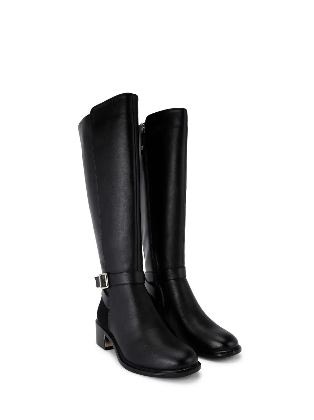 This Helen High Leg boot features a strap around the ankle with gold tone buckle and pin stud on the back of the ankle. Heel height: 4.5cm. Upper – 100% Polyurethane, Lining. and Sock – 100% Polyurethane. Sole – 100% Rubber.