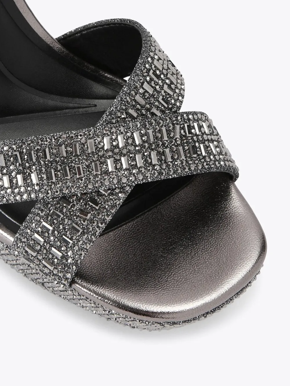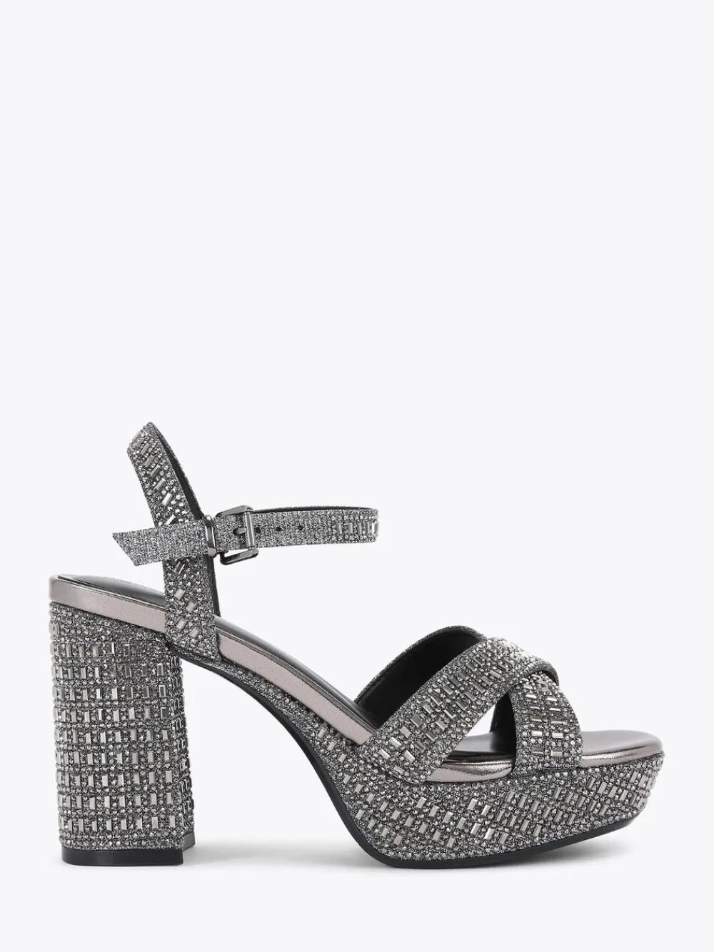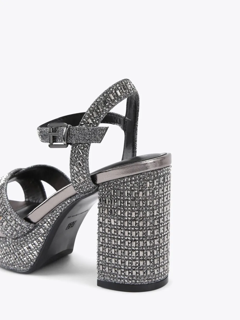 The Fleur Platform bling block heel features a black fabric upper embellished with black crystals. The ankle strap is fastened with a silver buckle. Heel height: 6.5cm. Heel height 9.5cm. Main – Textile, Lining – 100% Synthetic rubber. Sole – 100% Synthetic rubber.